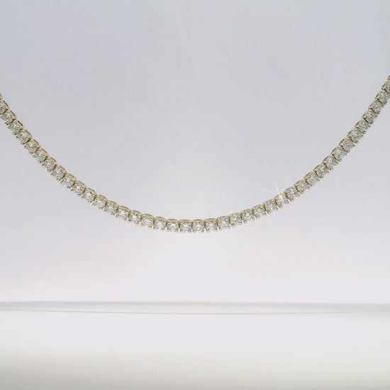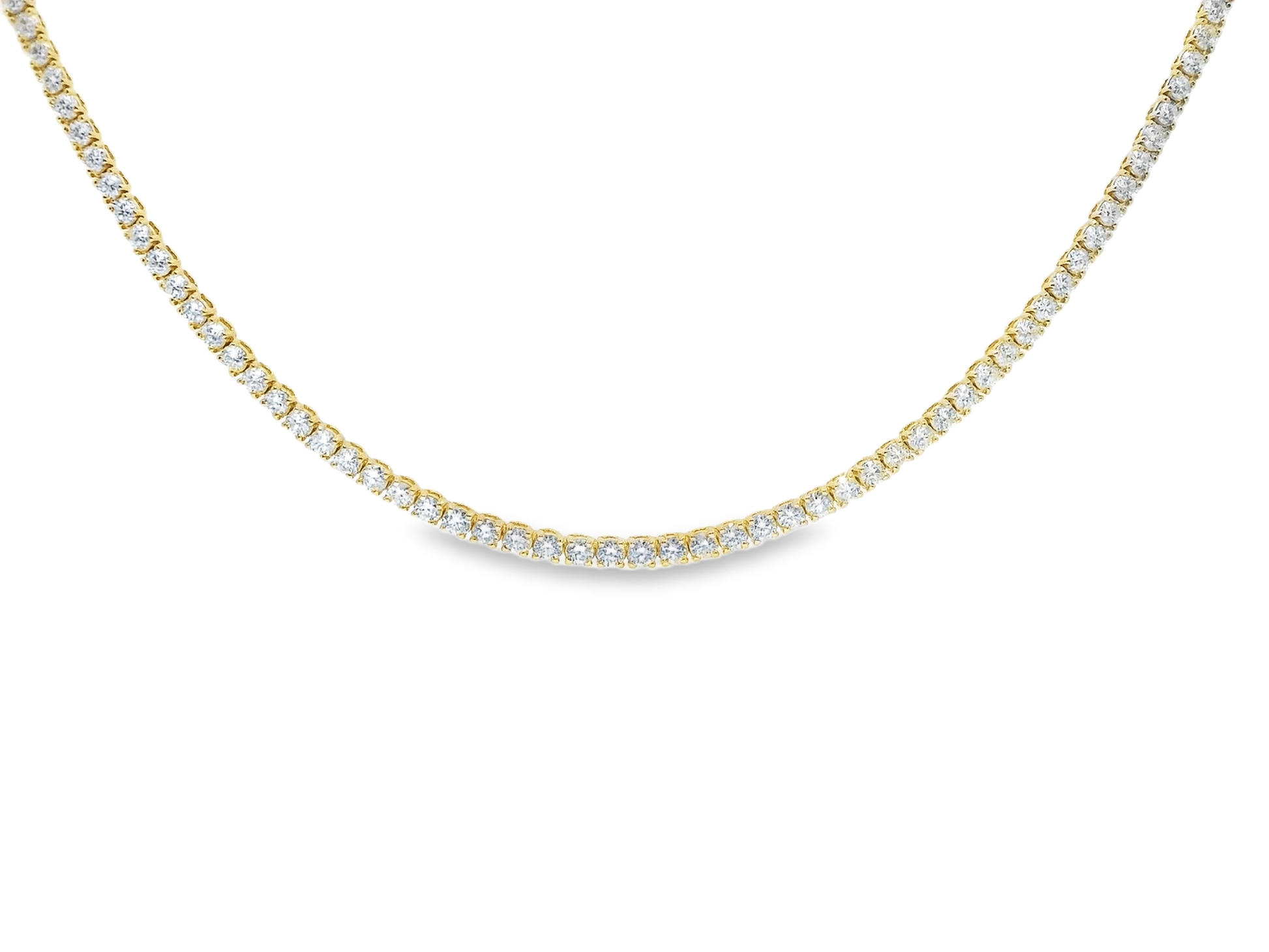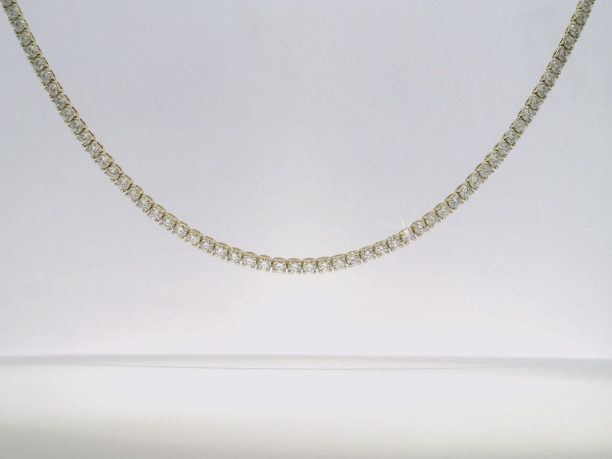 Expertly crafted with 6.13CT round cut diamonds, this tennis necklace exudes luxury and sophistication. Set in 14K yellow gold, it shines with a timeless elegance and is secured with a 4 prong setting. Elevate your style with this stunning piece that boasts expert craftsmanship and impeccable design.