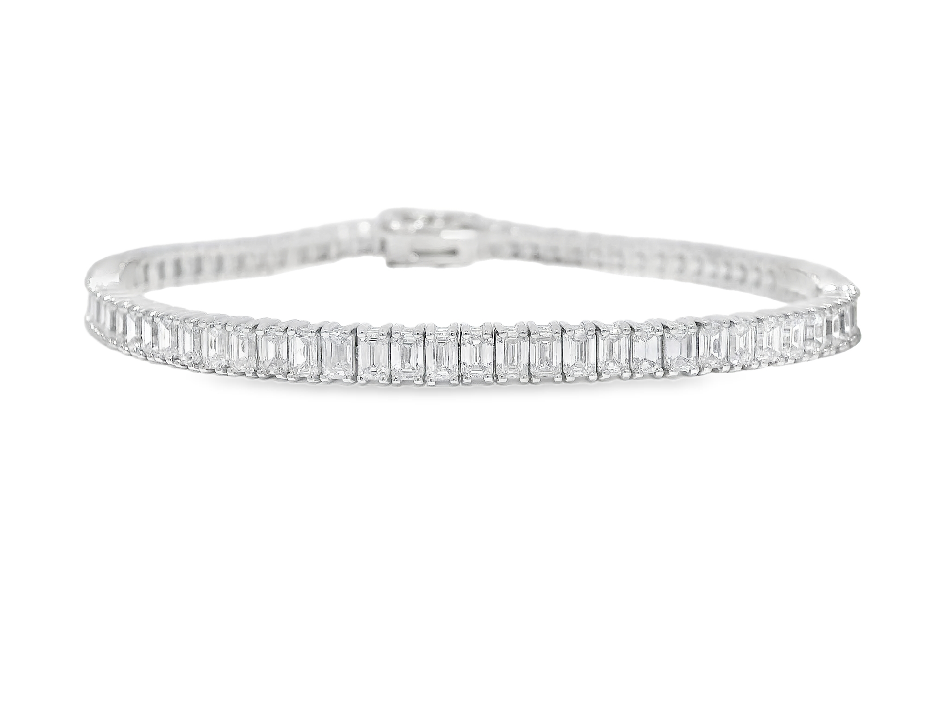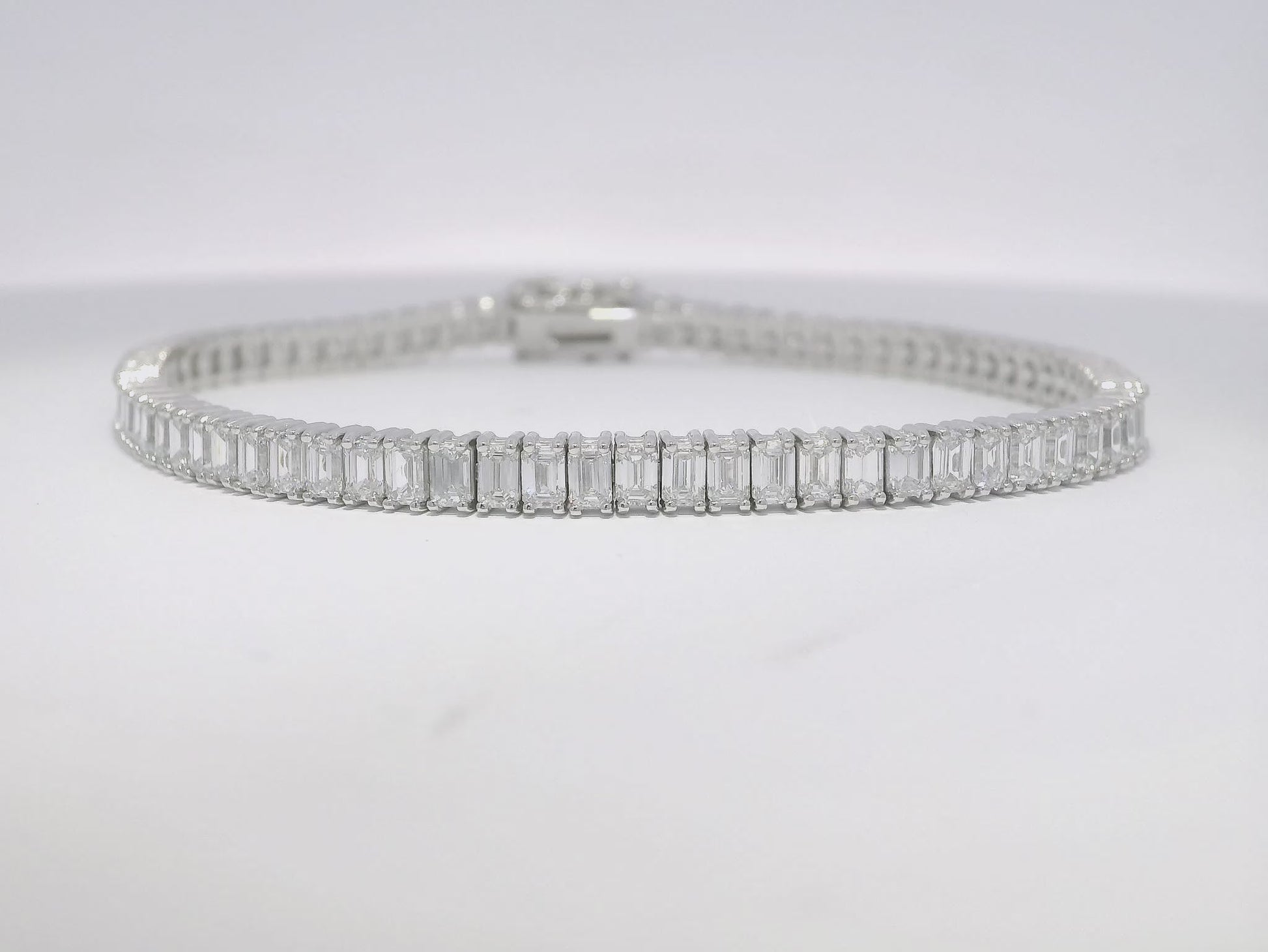 This 14K white gold tennis bracelet features 6.89CT of emerald cut lab diamonds. With a professional and elegant design, this bracelet adds a touch of sophistication to any outfit. Made with high quality materials, it is a perfect addition to your jewelry collection.
