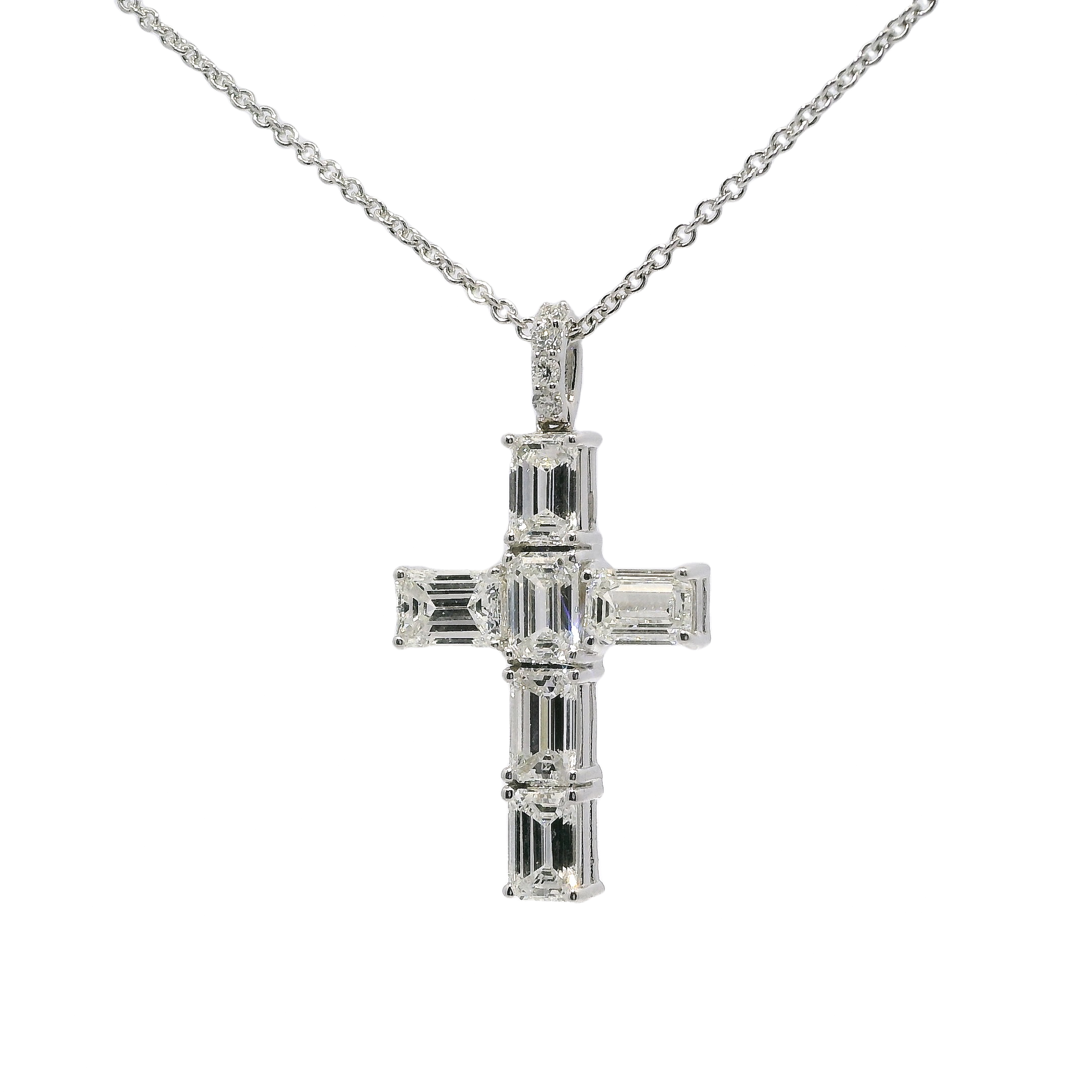 The Cross Diamond Pendant is a breathtaking symbol of faith and elegance. Meticulously crafted in 14K white gold, the cross pendant features dazzling baguette-cut diamonds, perfectly aligned to create a harmonious and radiant design. Suspended from a delicate chain, the necklace exudes sophistication and timeless beauty, making it a versatile piece for daily wear or special occasions.