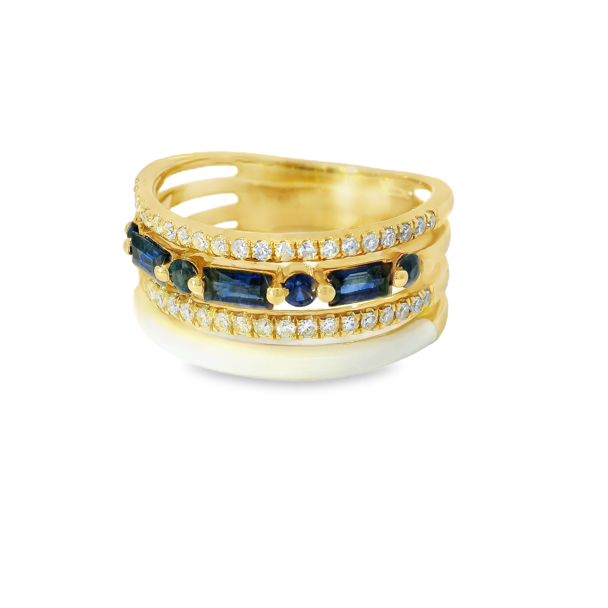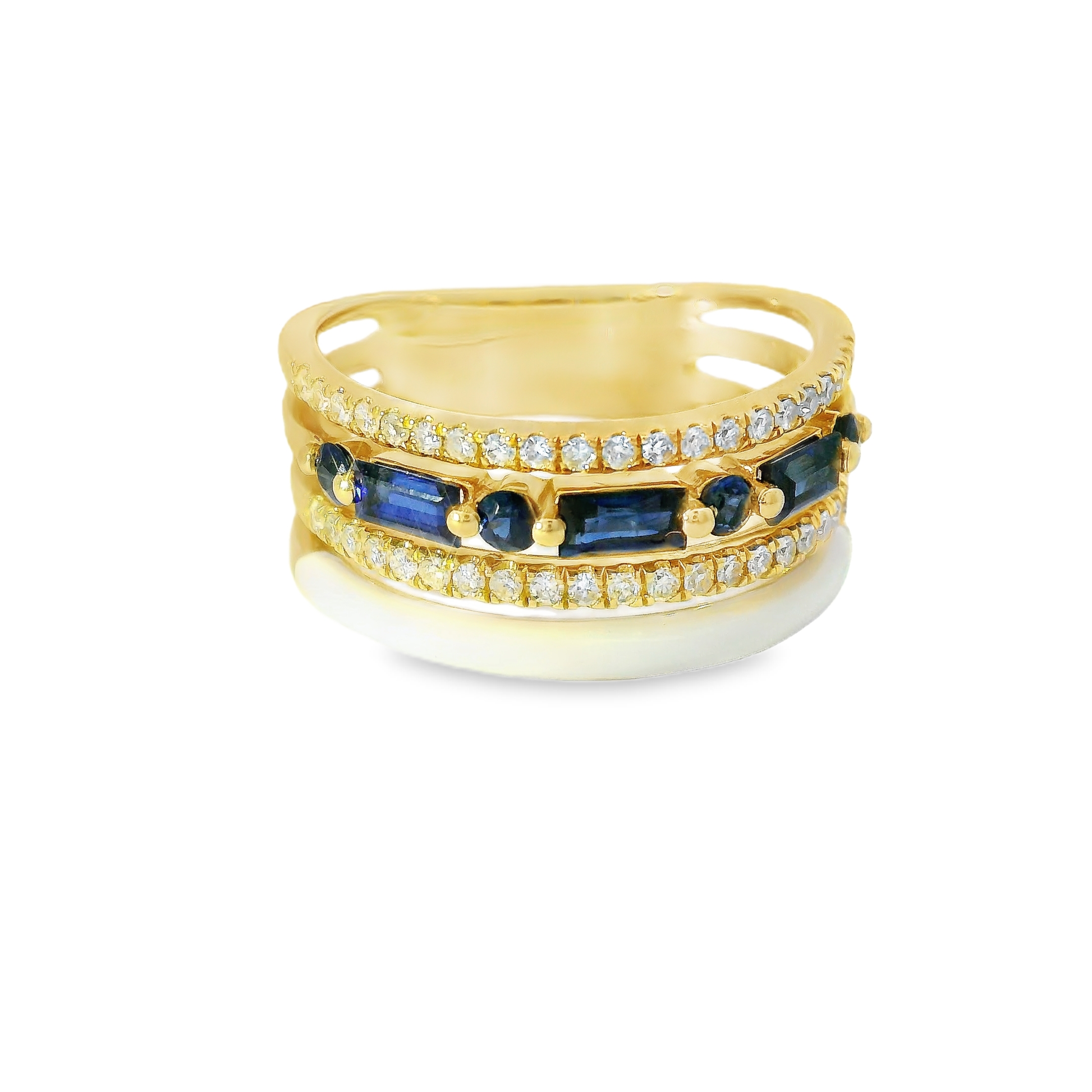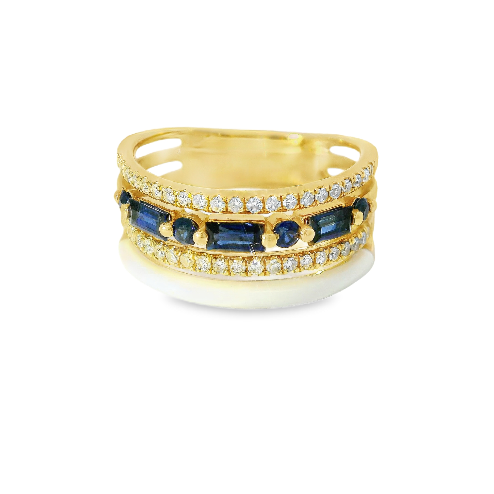 This exquisite 14K rose gold ring features a sparkling 0.24CT diamond and a stunning 0.76CT blue sapphire, accented with white enamel detailing. Crafted with attention to detail, this piece will add a touch of elegance and sophistication to any ensemble.