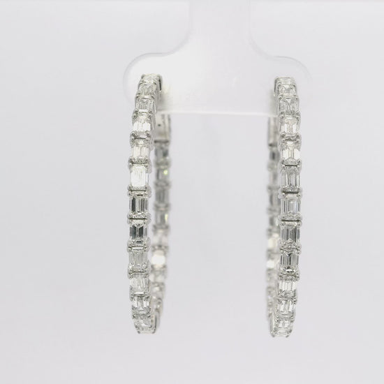 Expertly crafted with 14k white gold, these striking hoop earrings feature a stunning 3.79CT lab emerald cut center stone. The unique cut adds depth and dimension to the earrings, while the high-quality gold ensures long-lasting beauty. A beautiful and sophisticated addition to any jewelry collection.