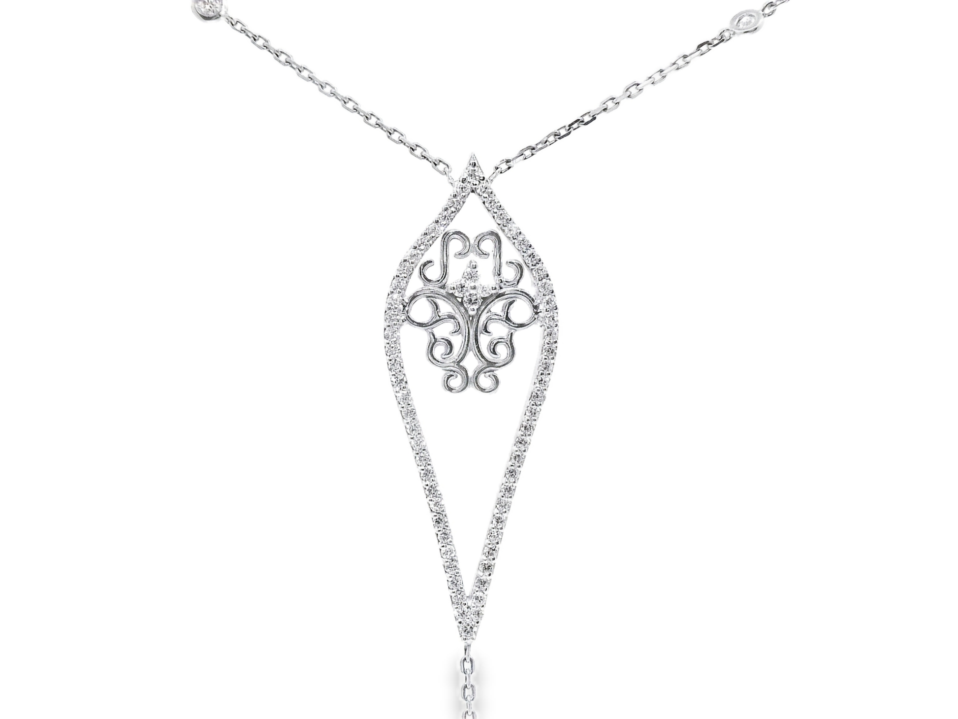 This beautiful pendant features a 0.90CT diamond set in 14k white gold. The diamond is held securely in a classic prong setting, allowing it to catch the light and sparkle brilliantly. A timeless piece that adds elegance to any outfit.