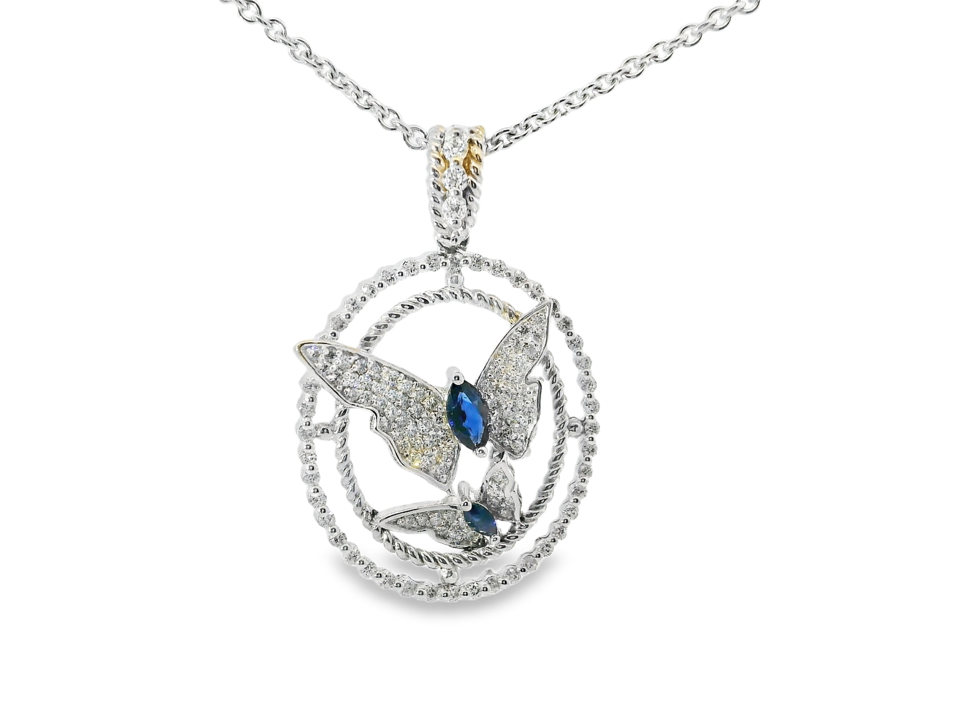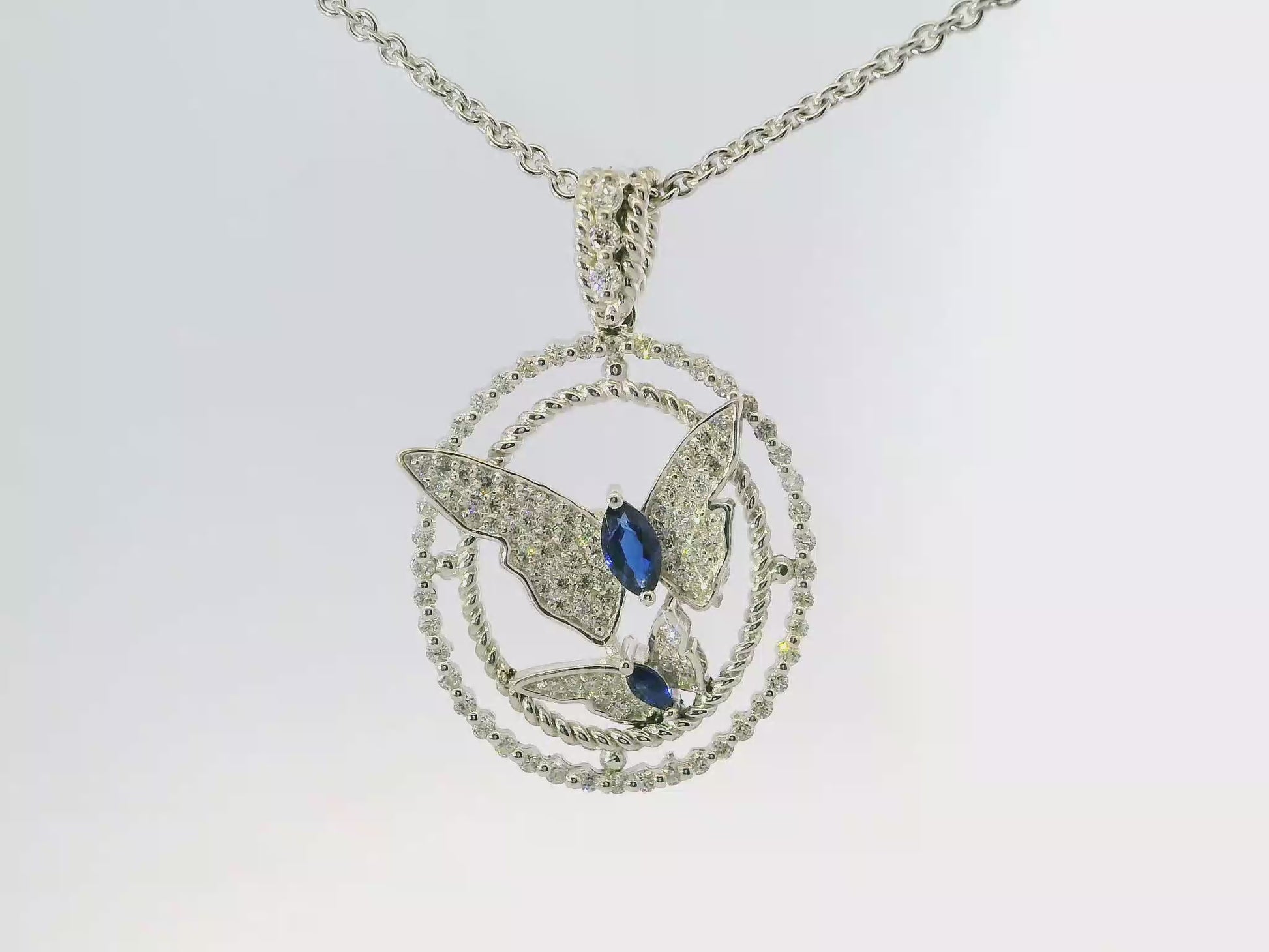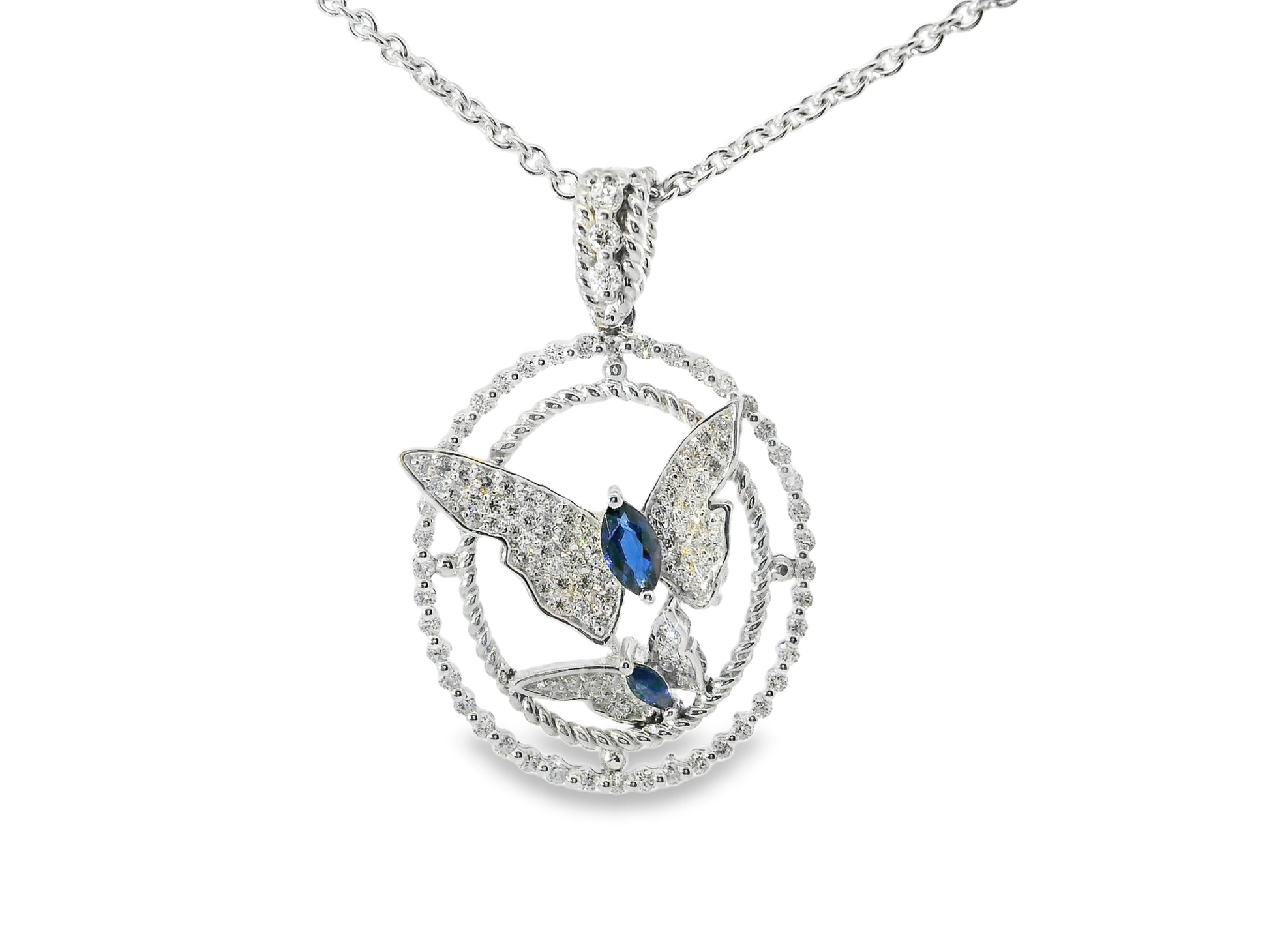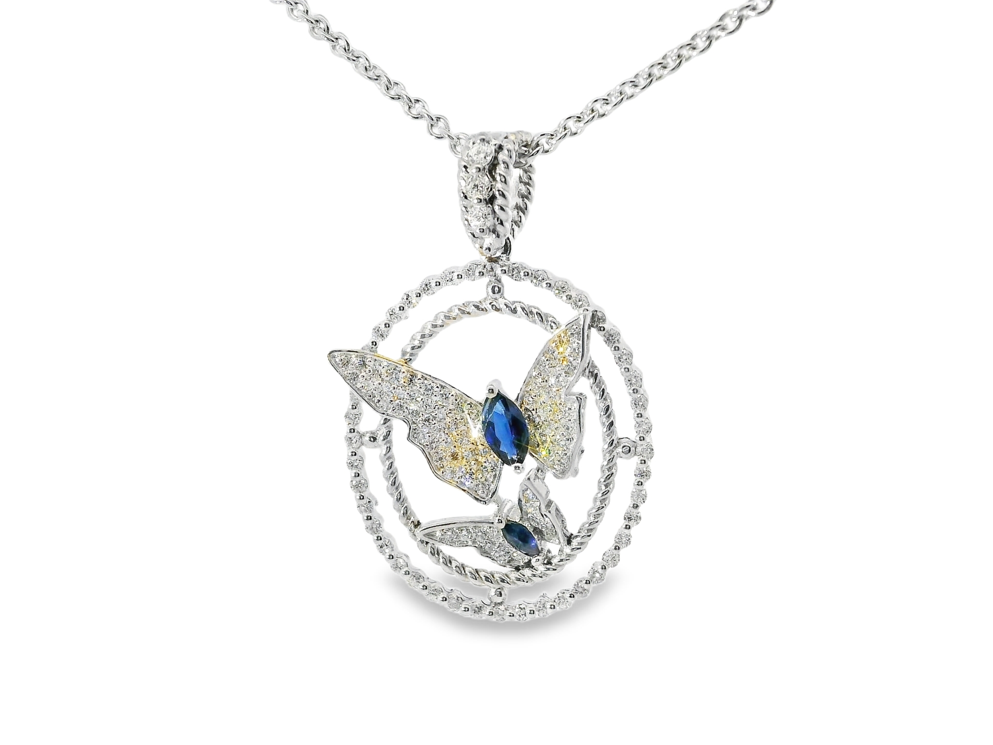 This exquisite piece features a brilliant 0.83-carat diamond paired with a 0.35-carat blue sapphire, set in elegant 14k white gold. The combination of these gemstones offers a striking contrast, enhancing the diamond’s sparkle and the sapphire’s deep hue. Crafted with precision, this jewelry piece balances luxury and timeless sophistication, ideal for those seeking refined elegance.