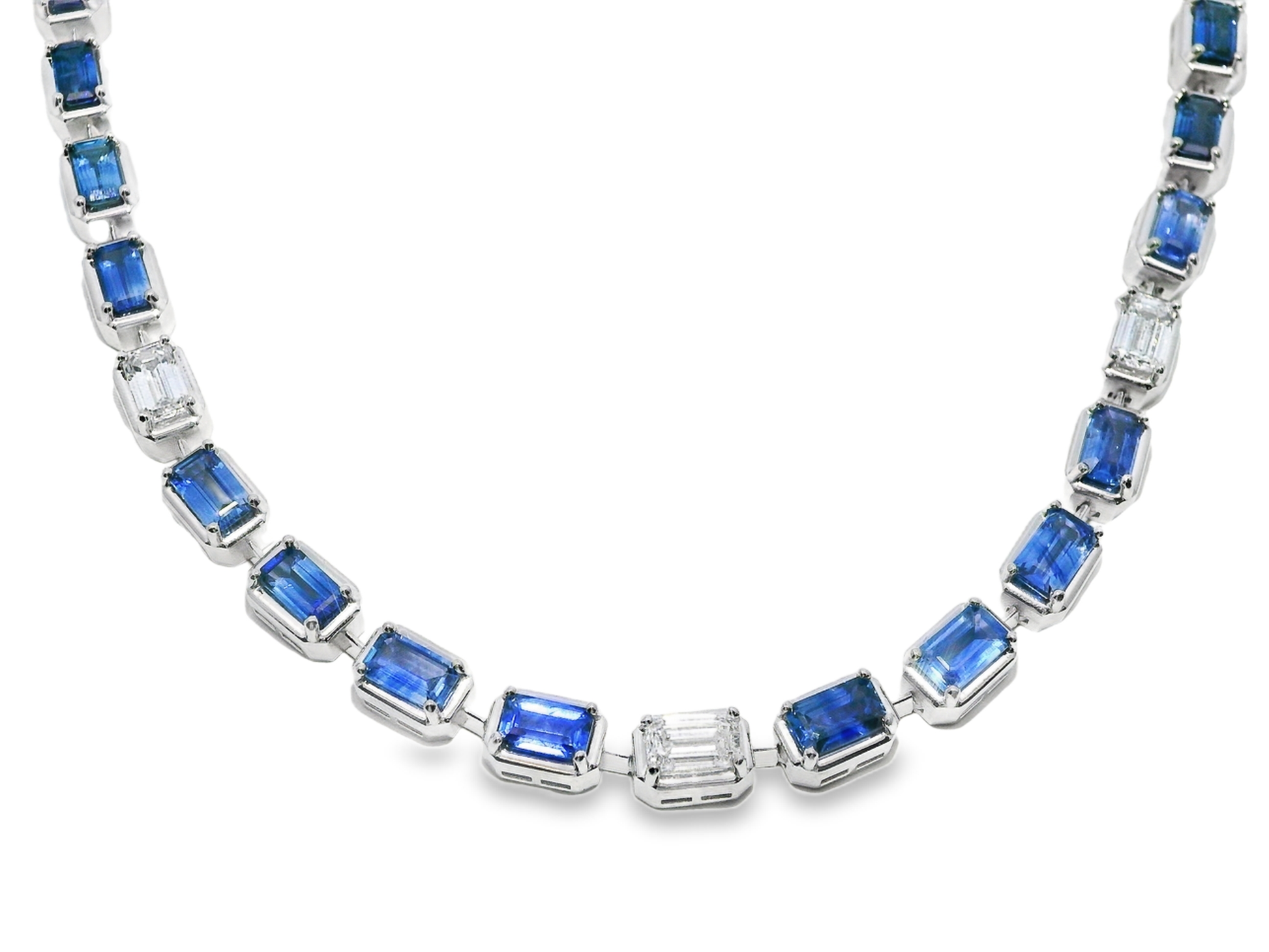 3.53CT Emerald Cut Lab Diamond 12.09CT Blue Sapphire 14K White Gold Necklace