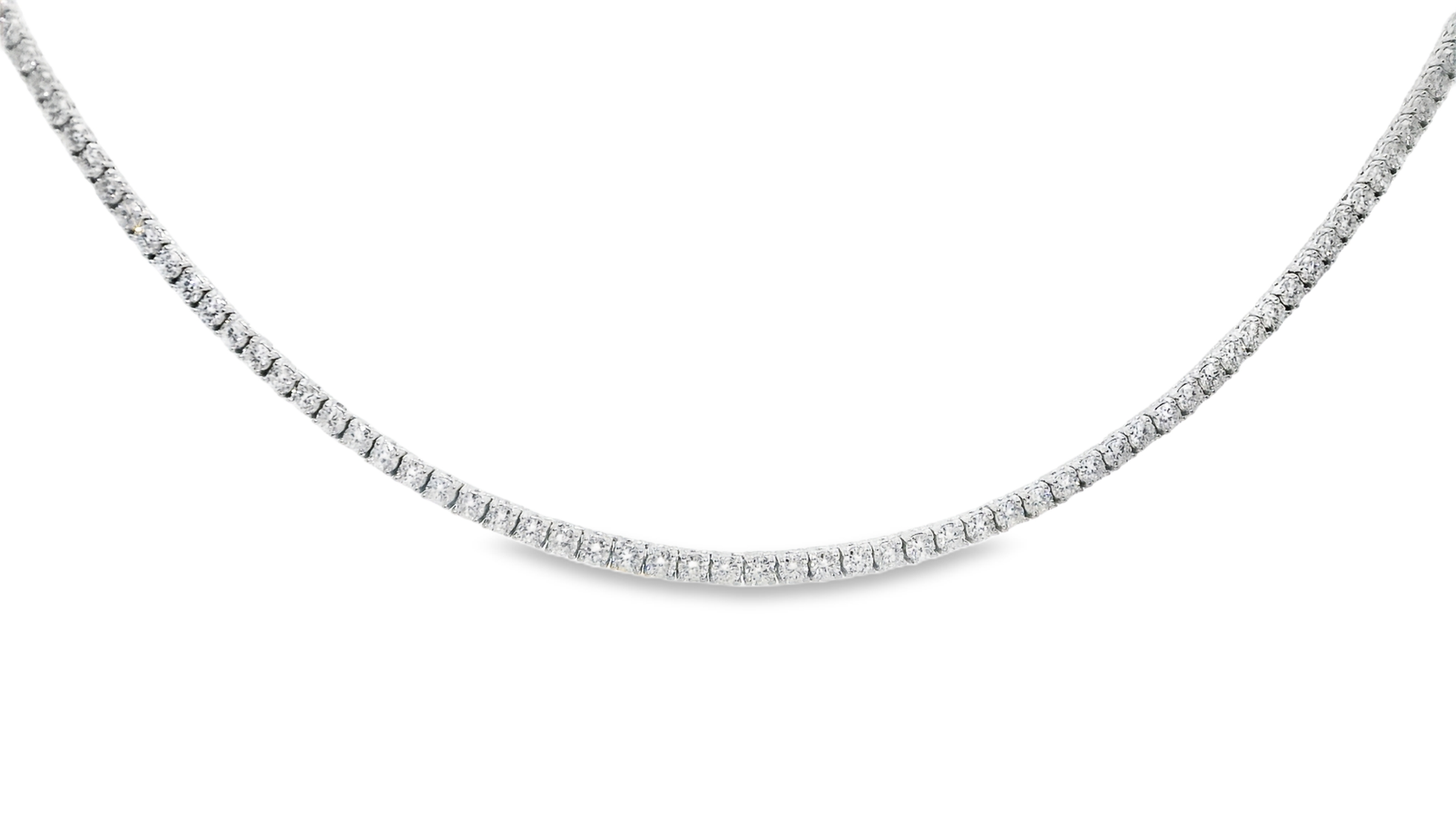 This 6.60-carat diamond tennis necklace features expertly set diamonds secured by classic four-prong settings, enhancing their brilliance and security. Crafted in 14k white gold, it offers a refined, durable design ideal for elevating both everyday and formal looks with timeless elegance and exceptional sparkle.