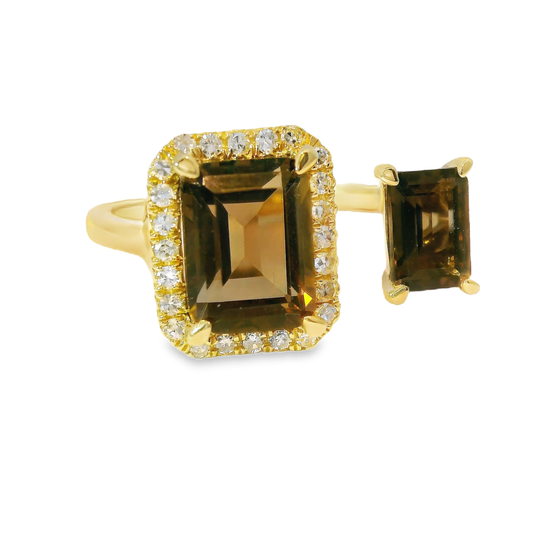 0.12CT Diamond and 2.16CT Emerald Cut Smokey Quartz Ring 14K Yellow Gold
