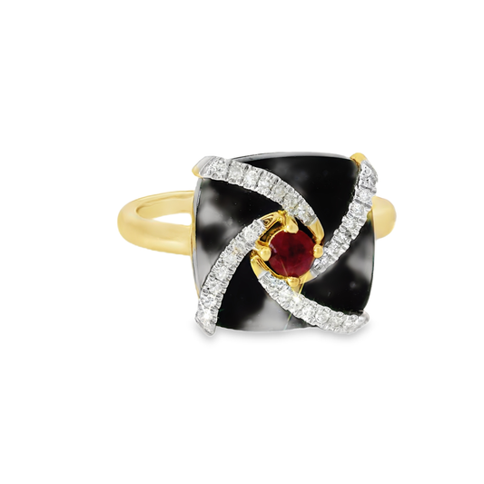 0.10CT Diamond and 0.16CT Pink Sapphire with Black Agate Ring 14K Yellow Gold