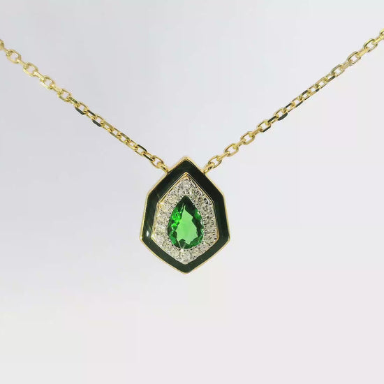 This elegant pendant features a 0.08-carat diamond paired with a rich dark green garnet, set in luxurious 14k yellow gold. Its refined design highlights the unique contrast between the sparkling diamond and the deep green garnet, making it a sophisticated choice for those seeking timeless elegance with a distinctive touch. Perfect for elevating both everyday and special occasion looks.