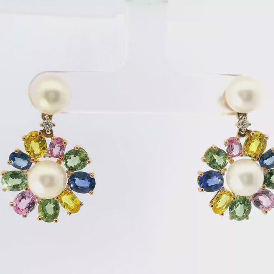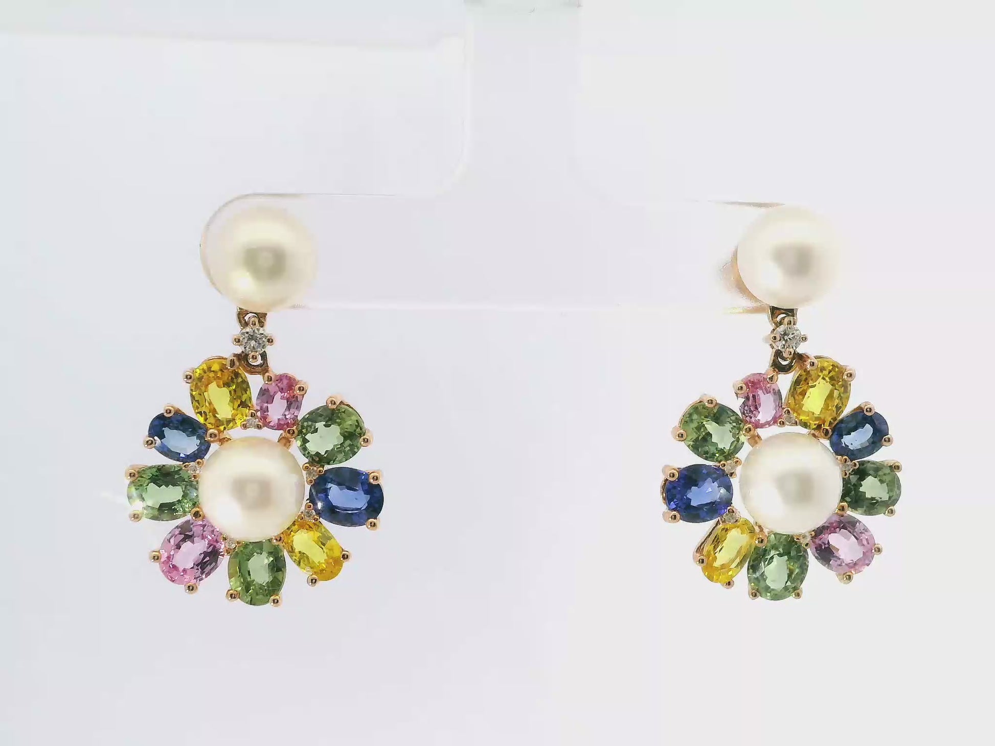 Elevate your elegance with these exquisite earrings featuring a 0.09 carat diamond and a stunning 7.45 carat array of multi-colored sapphires. Crafted in luxurious 14k rose gold, each earring is accented with a lustrous pearl, combining timeless sophistication with vibrant color. Perfect for those seeking a refined statement piece that balances classic beauty with expert craftsmanship.