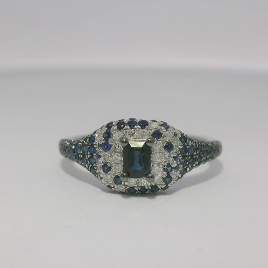 0.10CT Diamond & 0.83CT Blue Sapphire with Emerald Cut Blue Sapphire Centre Stone Ring 14k White Gold
