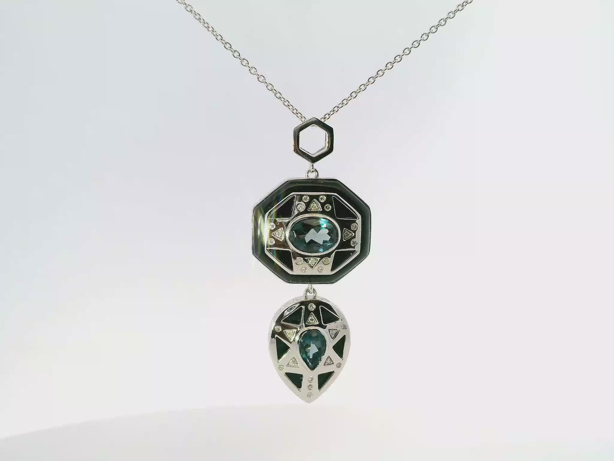 This elegant piece features a 0.10-carat diamond paired with a 1.49-carat black agate, set in refined 14k white gold. The combination highlights the diamond’s brilliance against the deep, smooth surface of the agate, creating a sophisticated contrast. Crafted with precision, this jewelry offers both timeless style and enduring quality, ideal for those seeking a distinctive yet classic accessory.