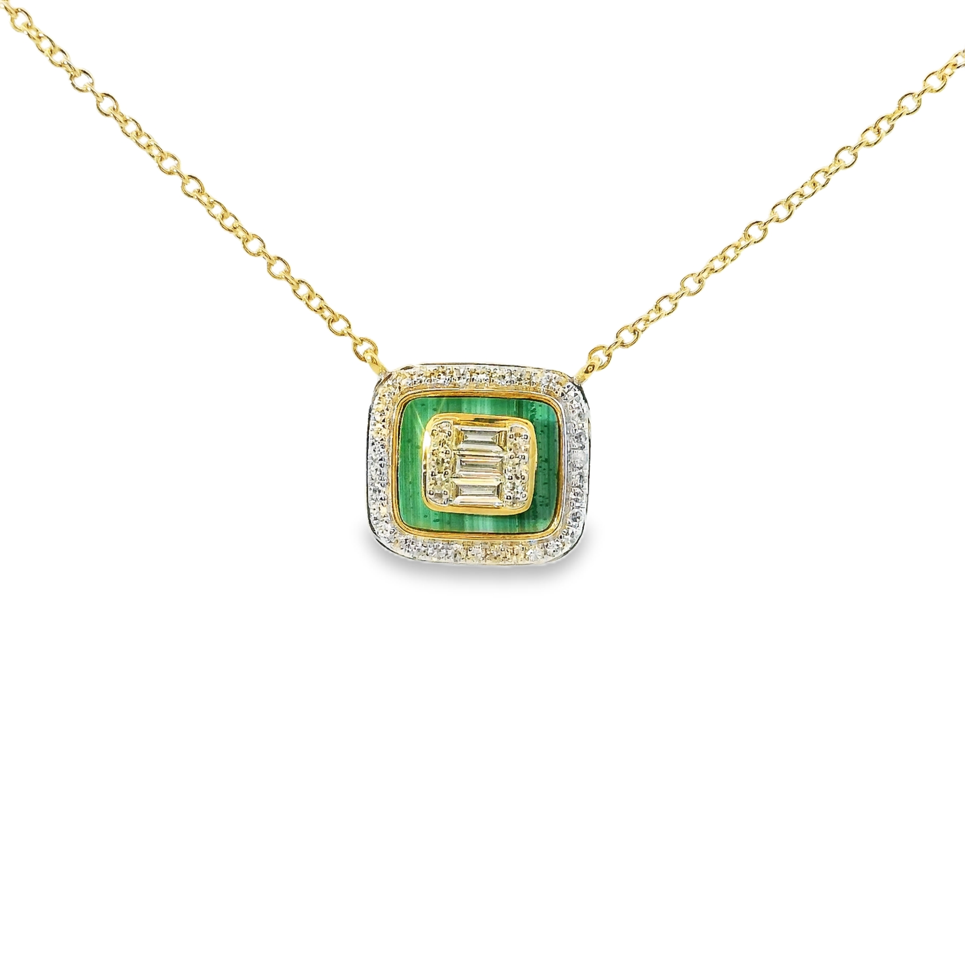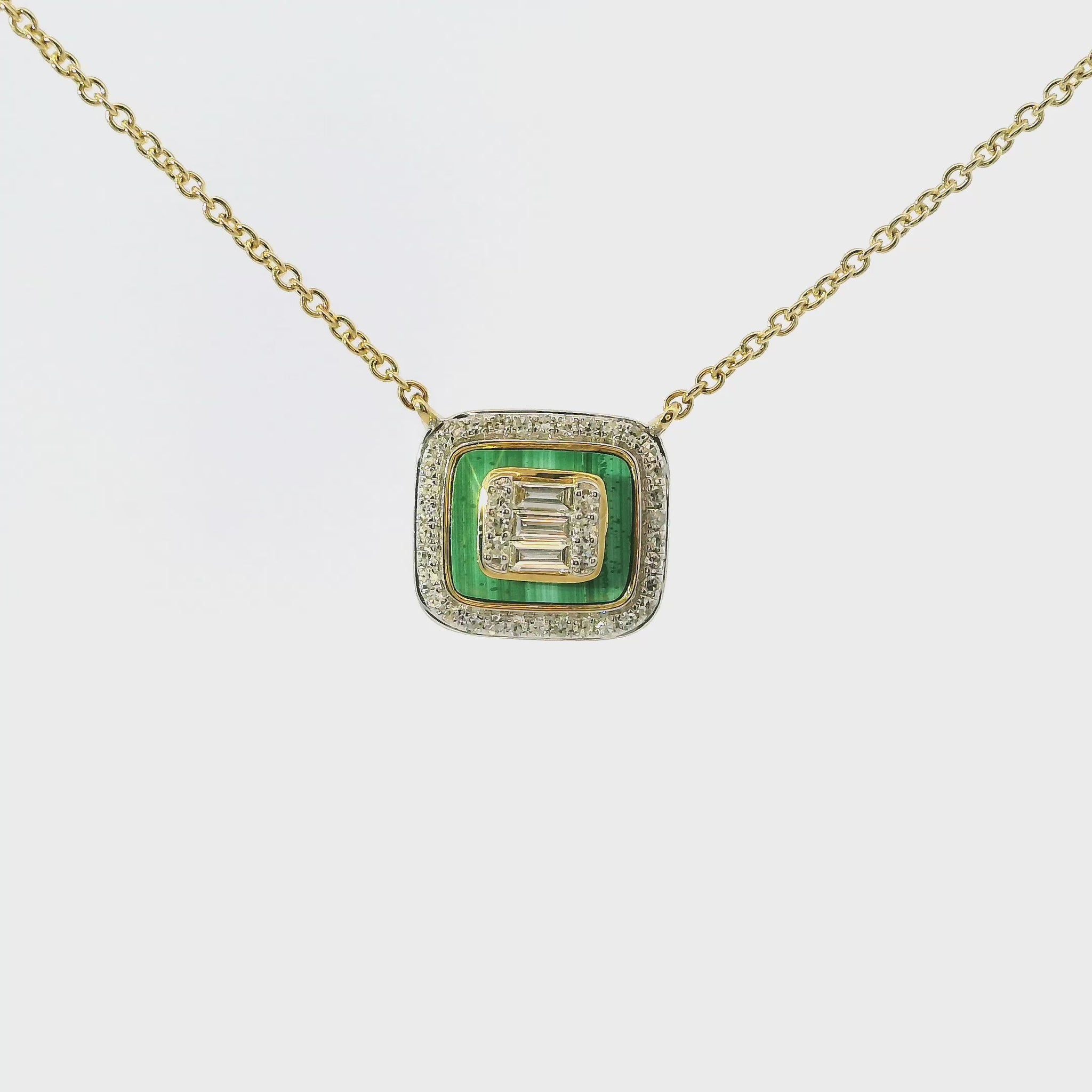 This exquisite gold pendant necklace features a stunning geometric design, perfect for adding a touch of sophistication to any outfit. The intricate detailing and luxurious finish make it a standout piece for both casual and formal occasions. 0.14 CT Diamonds and Green Onyx