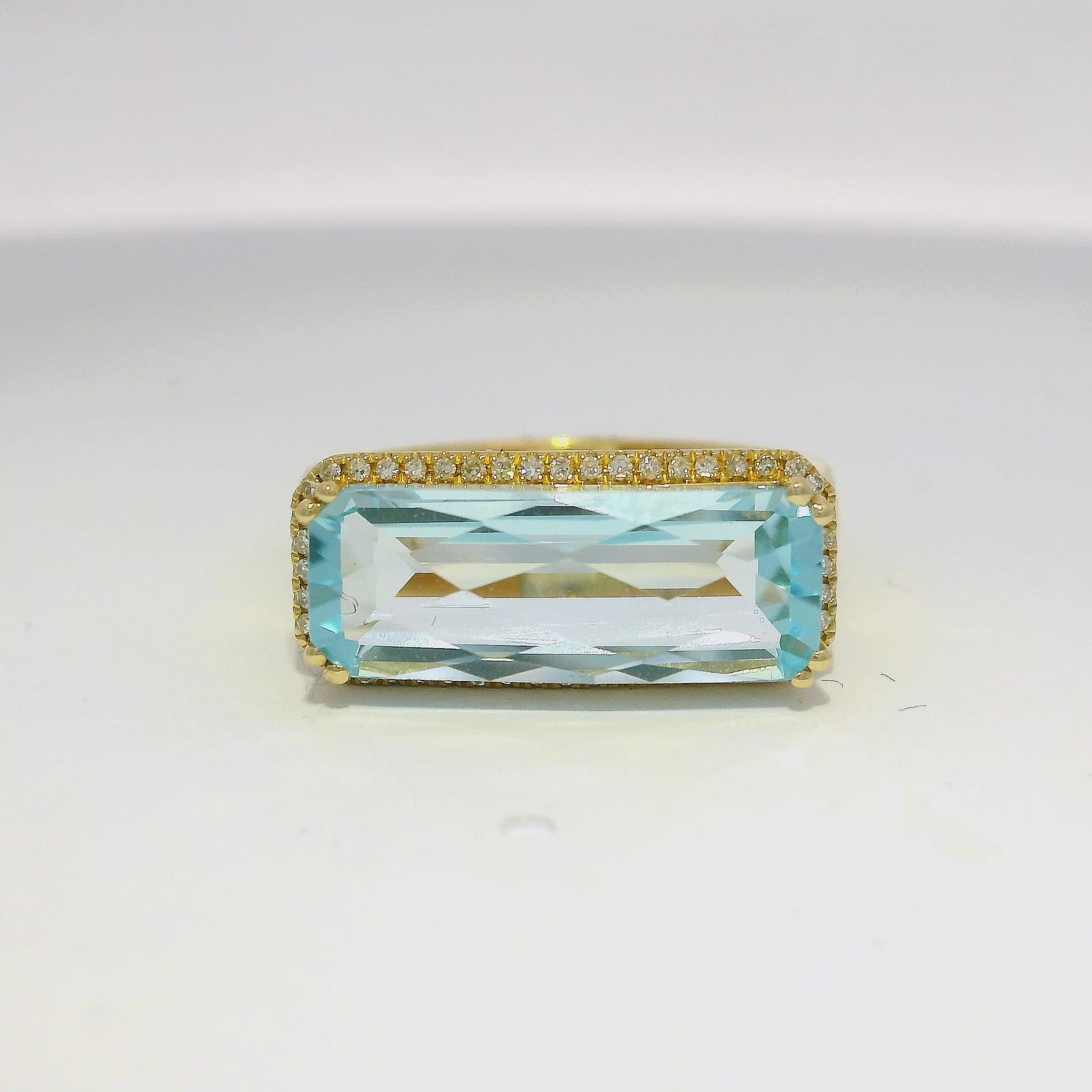 This diamond and light blue topaz ring is crafted in 14K yellow gold and boasts a 0.14CT diamond and a 4.40CT light blue topaz. The beautiful combination of diamond and topaz creates a stunning contrast, making this ring a must-have for any jewelry collection. Experience elegance and luxury with this exquisite piece.