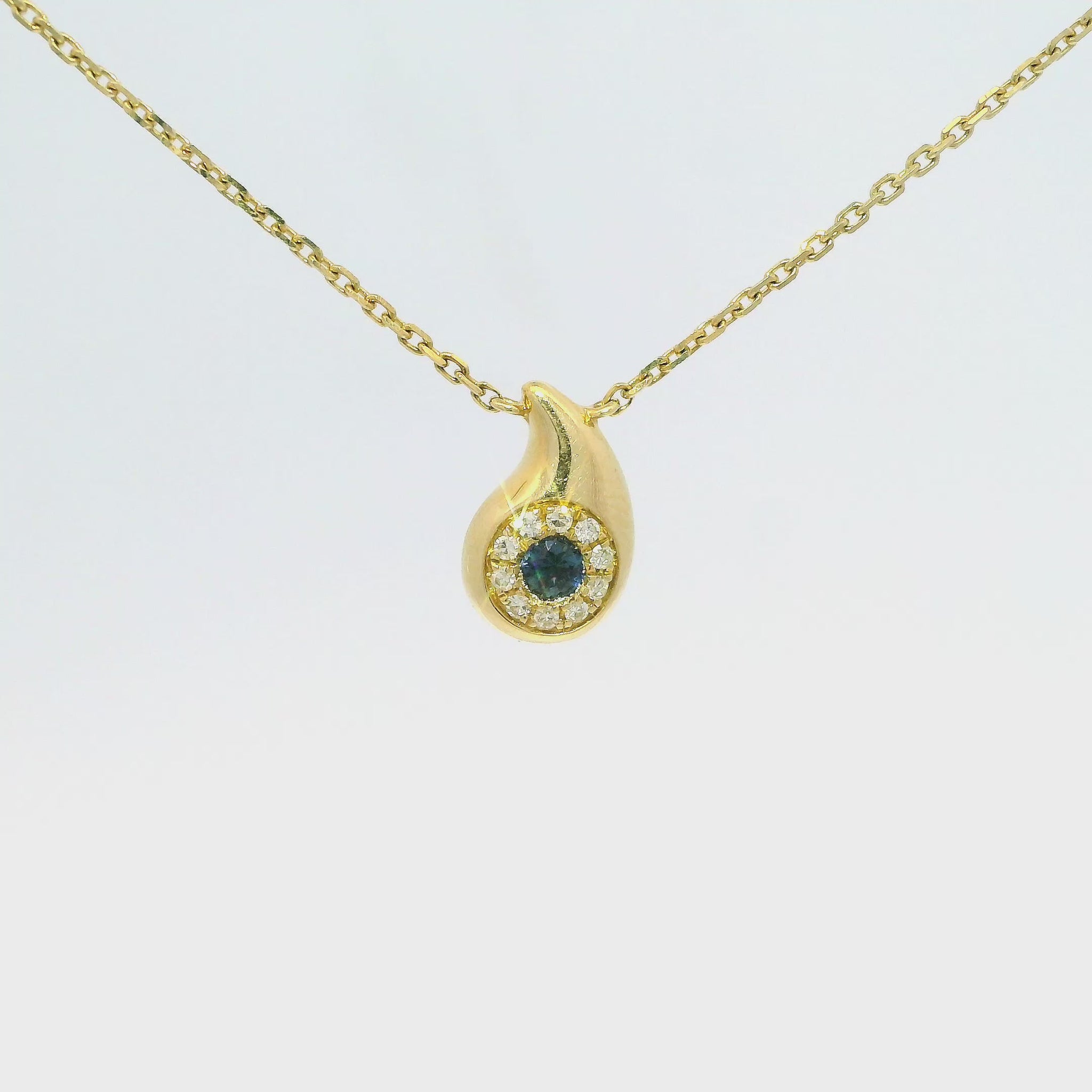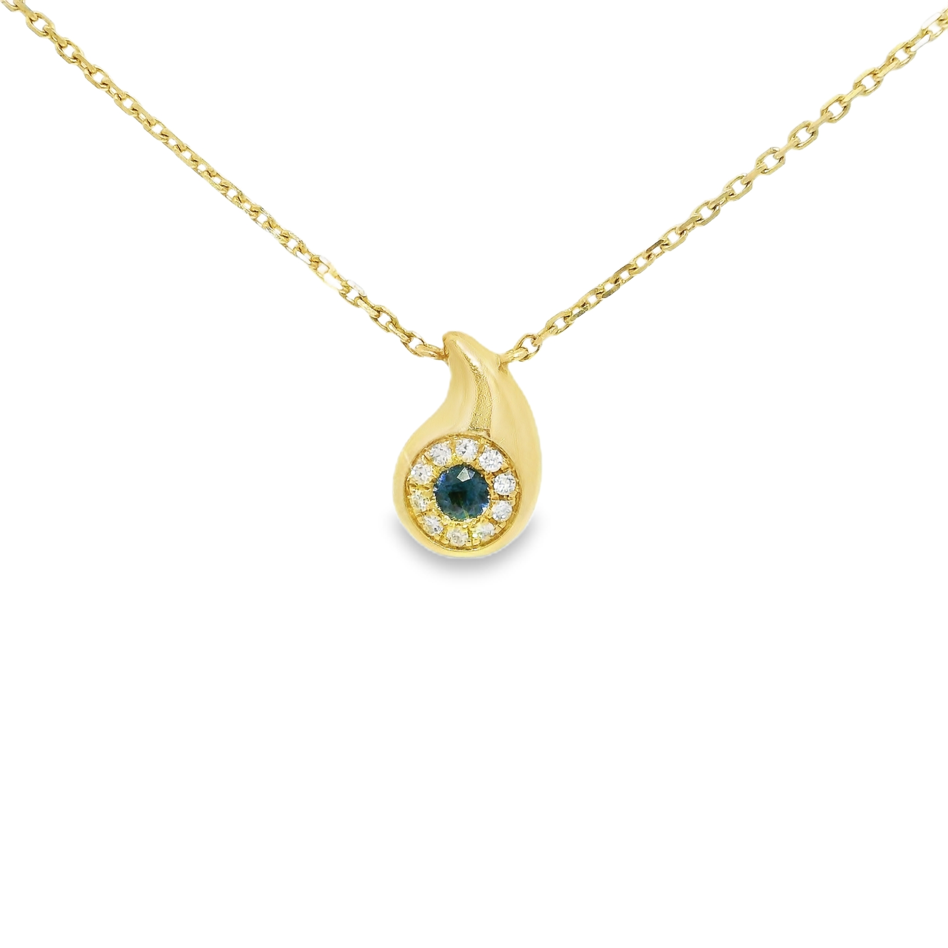 This exquisite gold pendant necklace features a unique teardrop design, adorned with a central dark gemstone surrounded by sparkling diamonds. Perfect for adding a touch of elegance to any outfit, this piece is a timeless addition to your jewelry collection. 0.08CT Diamonds ).12 CT Blue Sapphire