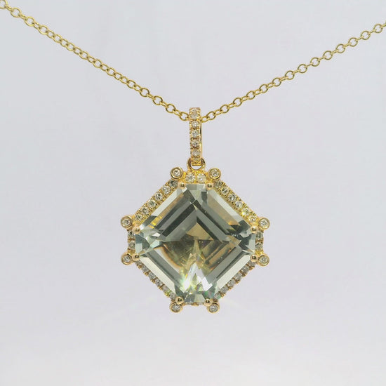 Expertly crafted with 0.32CT diamond and 12.38CT green amethyst, this pendant in 14k yellow gold exudes elegance and sophistication. The stunning combination of sparkling diamonds and the vivid green gemstone is sure to make a statement. Enhance any outfit with this luxurious piece.