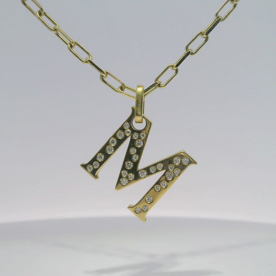 This 0.32CT M letter Charm Necklace is crafted in 18k Yellow Gold, adding a touch of elegance to any outfit. The charm features intricate detailing and sparkles with 0.32CT of diamonds. A perfect accessory for those who want to add a personal touch to their fashion. Enjoy the luxurious beauty of this necklace.