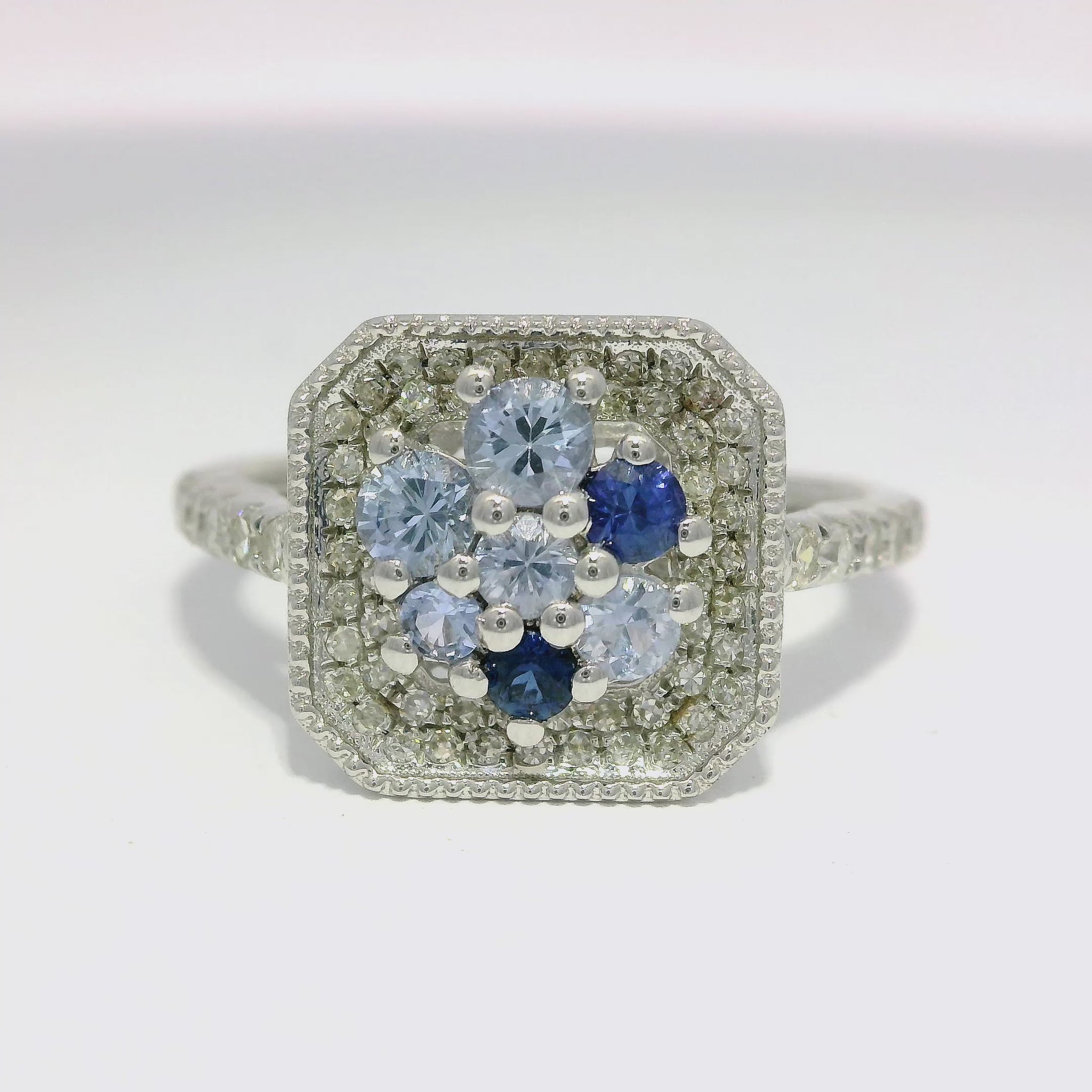 This 0.33CT Diamond and 0.66CT Multi Blue Sapphire Ring is expertly crafted in 14K white gold. The stunning combination of diamonds and sapphires creates a timeless and elegant look. Add a touch of luxury to any outfit with this beautifully designed ring. Size 7