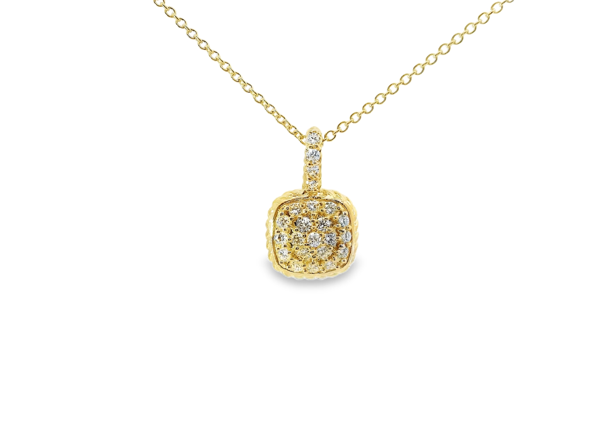 This 0.42CT Diamond Square Pendant in 14k Yellow Gold is a stunning and elegant piece of jewelry. With its shimmering diamond accents and high-quality 14k gold setting, this pendant exudes luxury and sophistication. Perfect for any occasion, this pendant is sure to make a statement and add a touch of sparkle to any outfit.