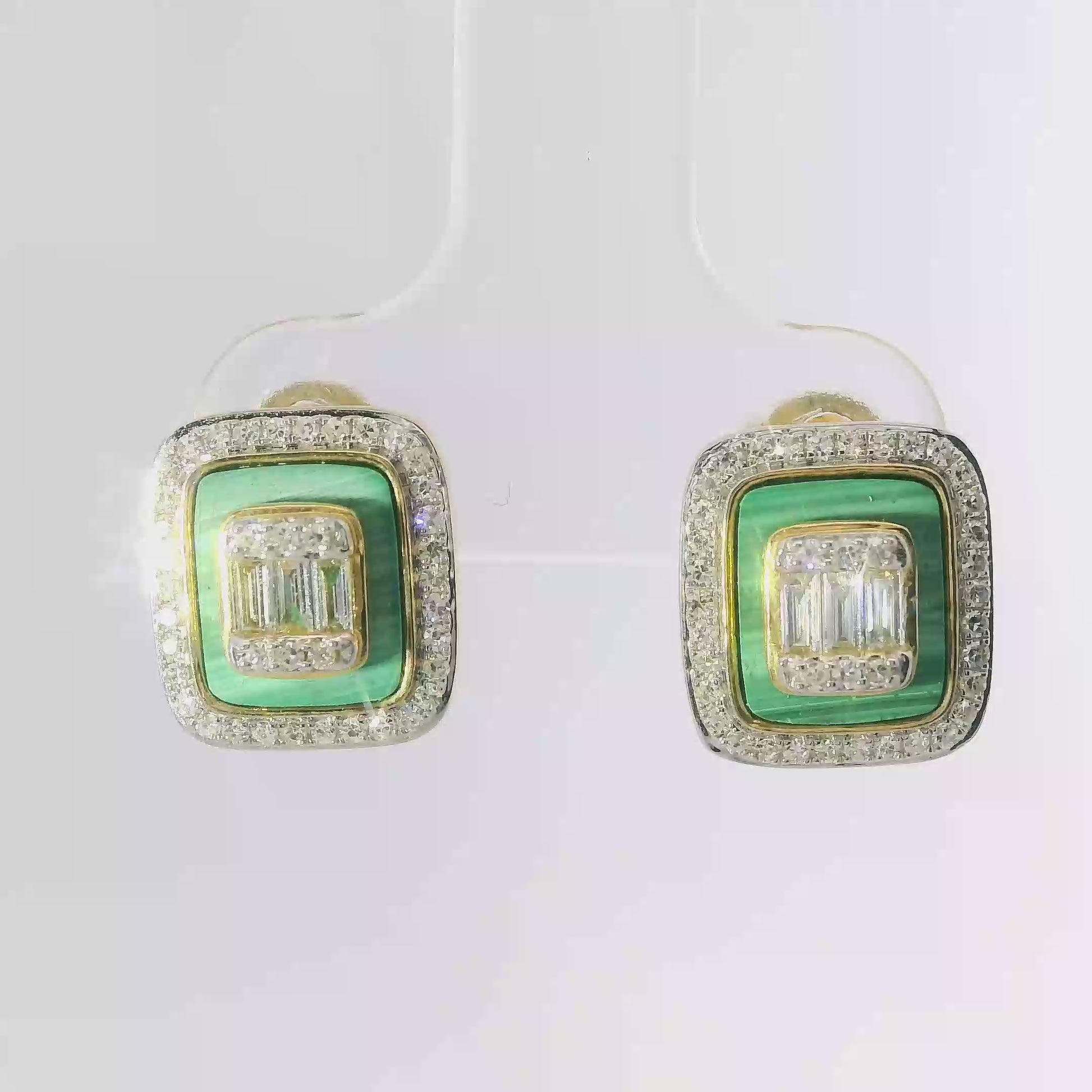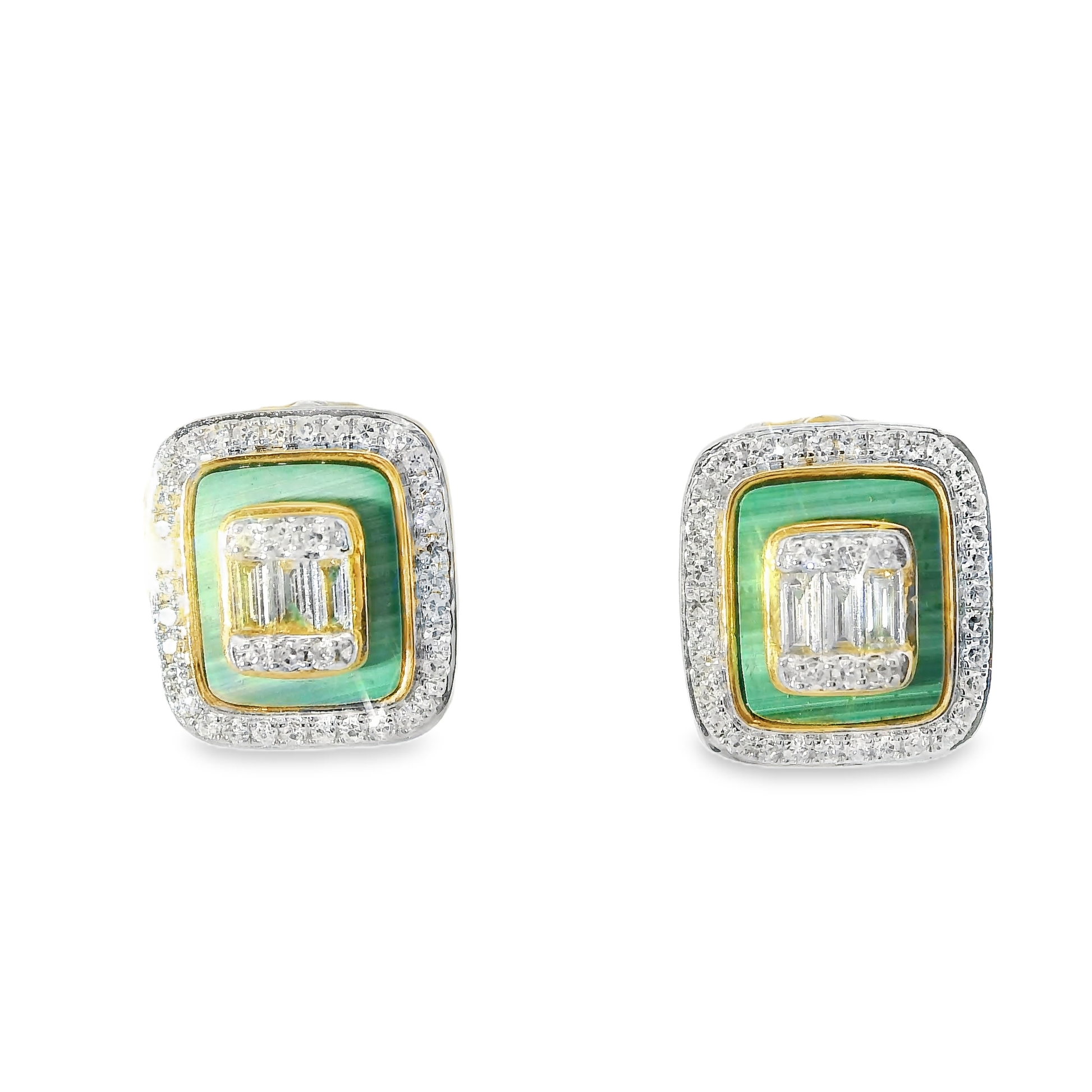 Elevate your elegance with these 0.45CT diamond earrings featuring vibrant green malachite set in 14k yellow gold. The combination of brilliant diamonds and rich malachite offers a sophisticated contrast, while the durable gold setting ensures lasting wear. Perfect for adding a refined touch to both everyday and special occasion looks.