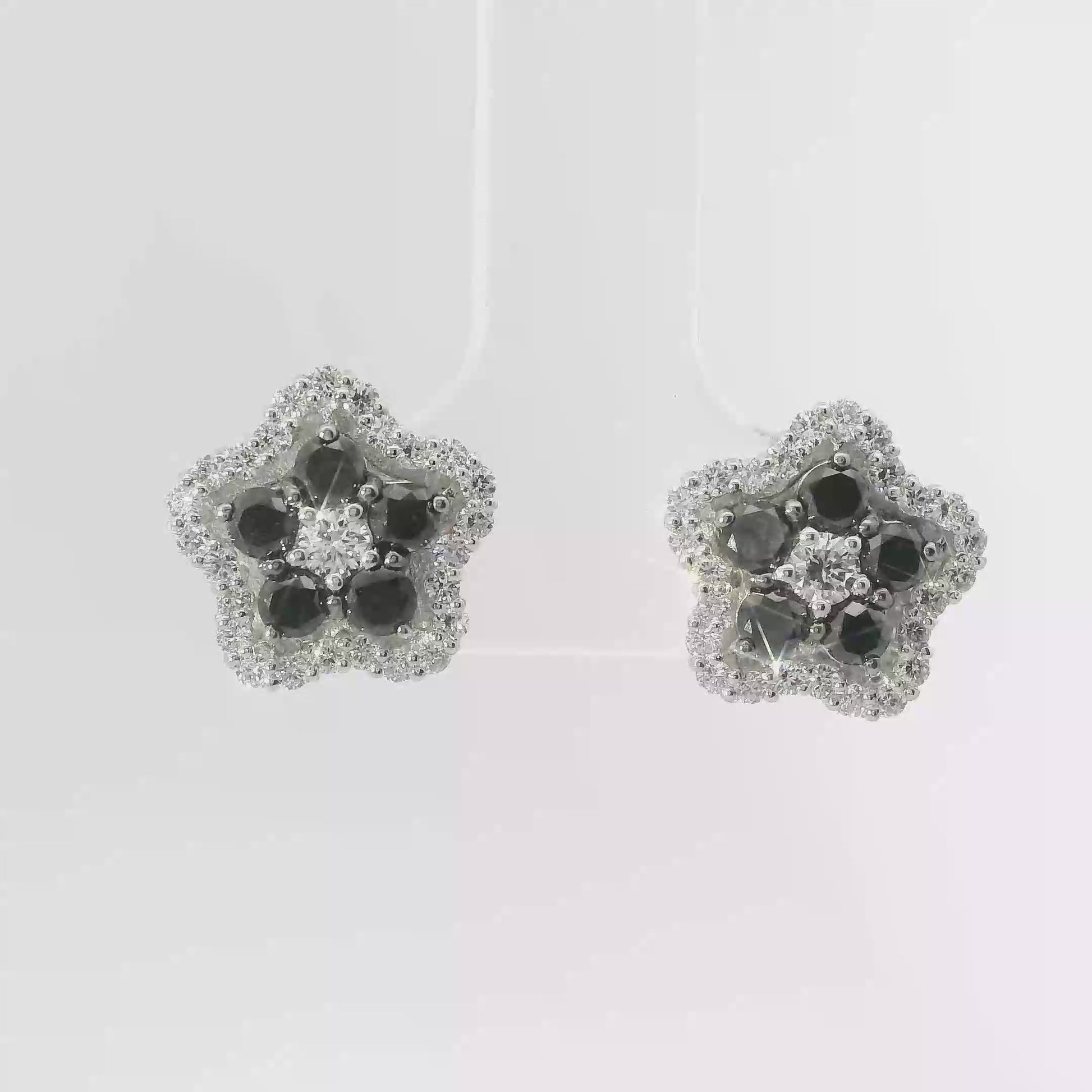These 14k white gold earrings feature a striking combination of 0.50 carats of white diamonds and 0.70 carats of black diamonds. Expertly crafted, they offer a sophisticated contrast that enhances the brilliance and depth of each stone. Perfect for adding a refined yet bold touch to any ensemble.