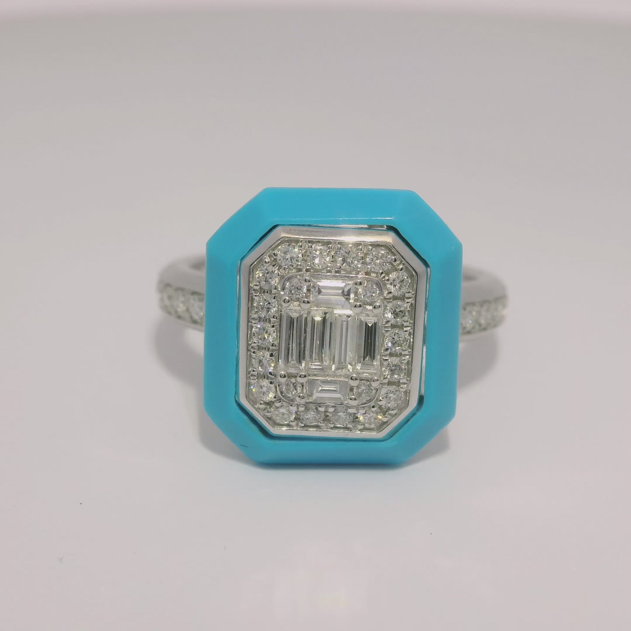 Experience elegance and luxury with our 0.59CT Turquoise & Diamond Ring in 14k White Gold. The stunning turquoise gemstone with sparkling diamonds creates a captivating and sophisticated look. Crafted with high-quality materials, this ring is the perfect addition to any jewelry collection.