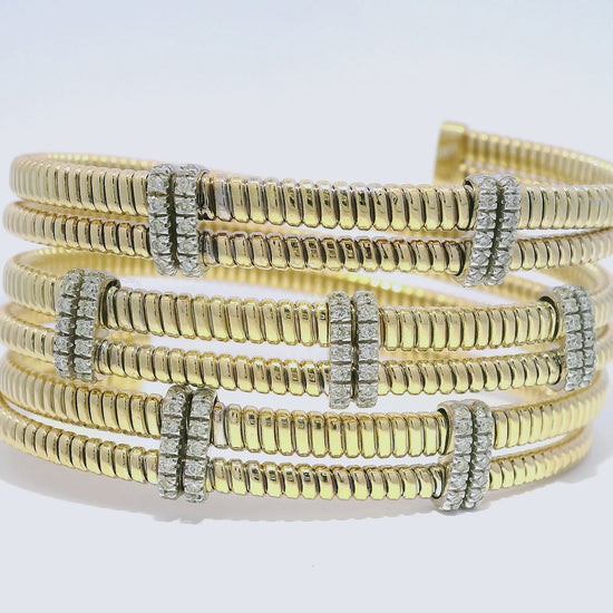 Expertly crafted with 14k yellow gold, this 0.71CT diamond bangle exudes elegance and sophistication. The sparkling diamonds, meticulously set in a timeless design, add a touch of luxury to any outfit. Make a statement with this stunning piece of jewelry.