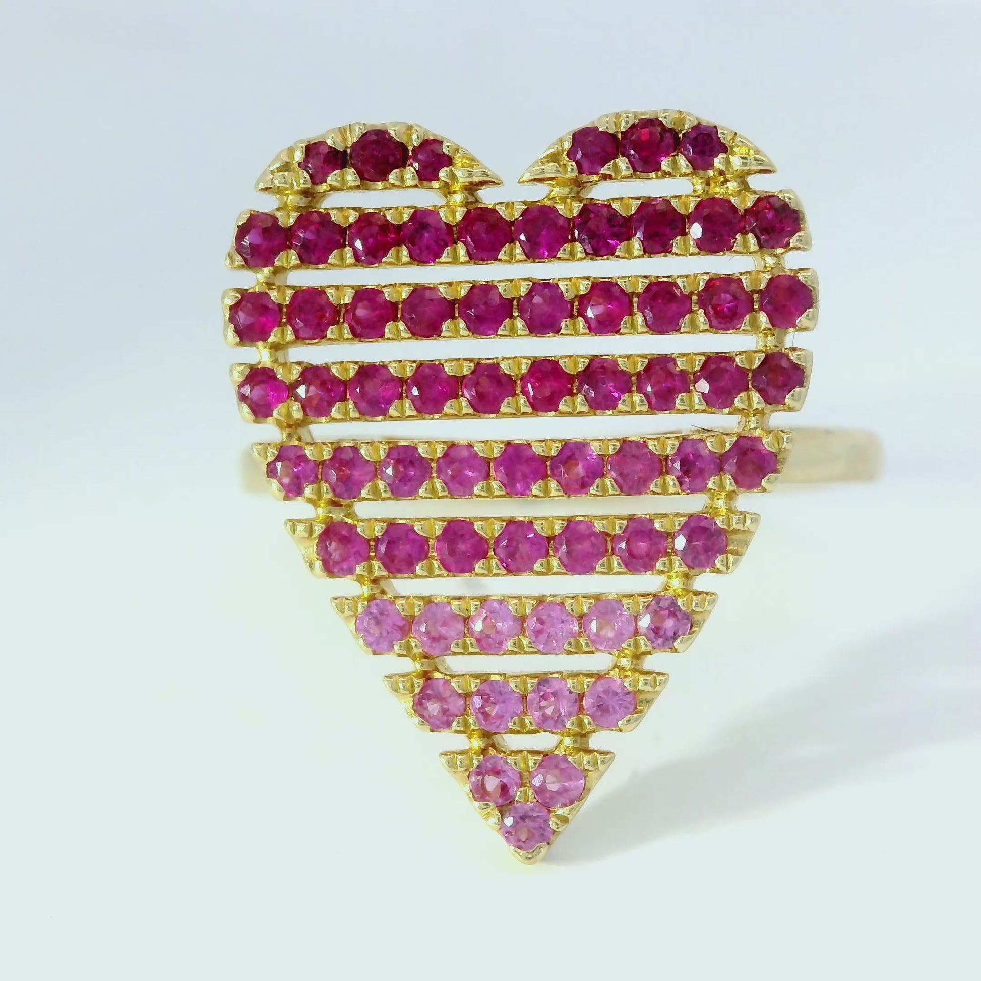 This 14K yellow gold ring features a romantic heart-shaped 0.91CT pink sapphire stone. Elevate any look with the eye-catching sparkle of this elegant and timeless piece. Perfect for adding a touch of femininity and sophistication to any outfit. Size 7