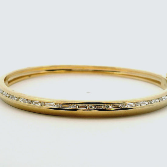 Expertly crafted with 0.98CT diamonds, this 14k yellow gold bangle exudes sophistication and luxury. The perfect accessory for any occasion, it adds a touch of elegance to any outfit. Its high-quality materials and intricate design make it a timeless and exquisite piece.