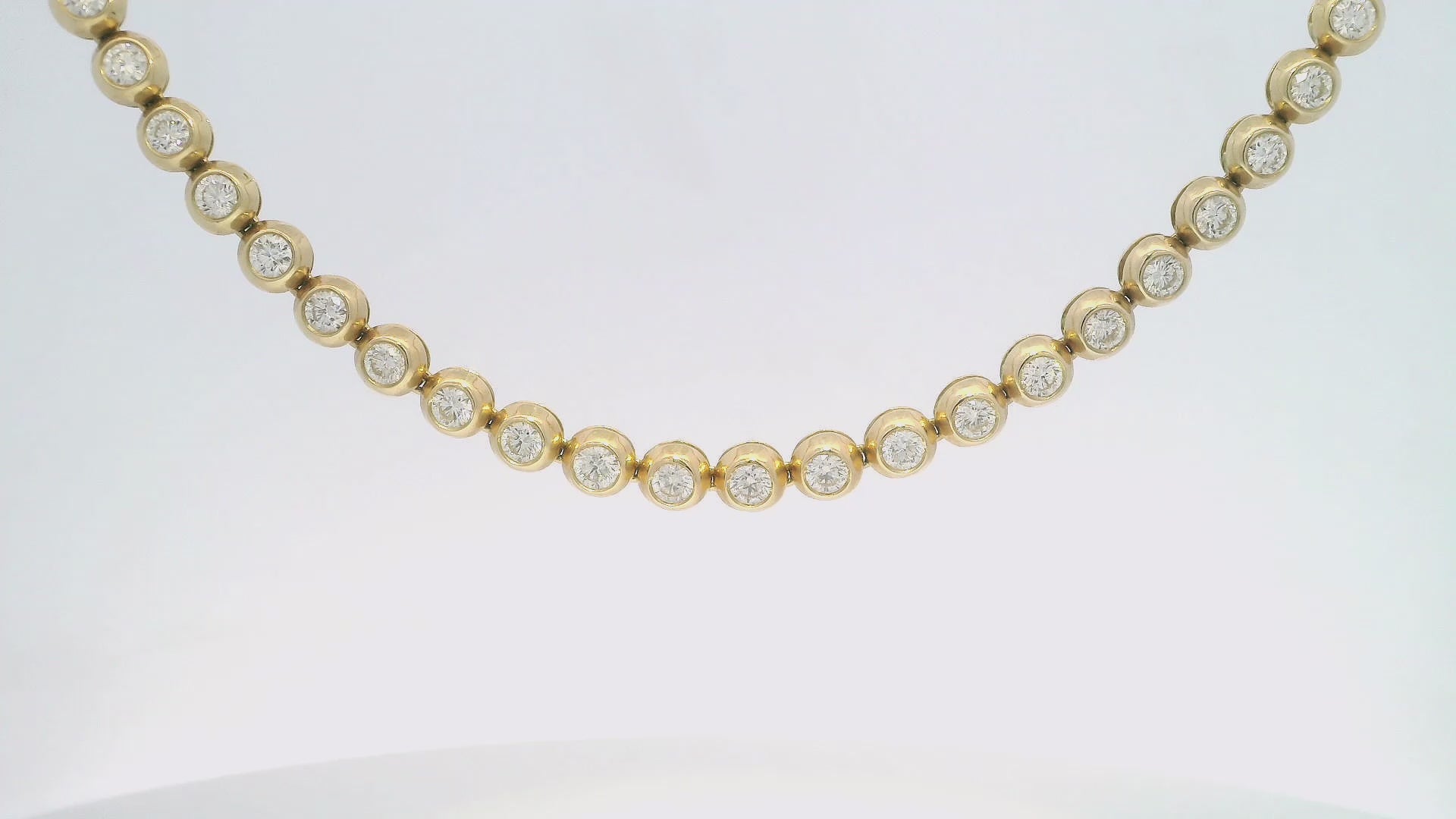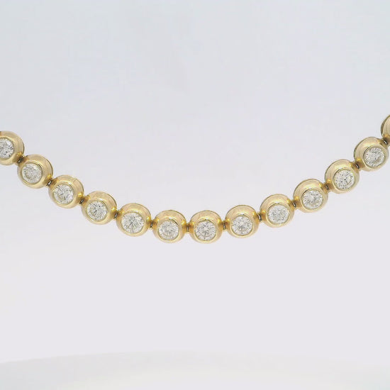 This stunning gold necklace features a series of sparkling diamonds, each set in a delicate circular frame. Perfect for adding a touch of elegance to any outfit, this piece is ideal for both casual and formal occasions. Its timeless design ensures it will be a cherished addition to your jewelry collection. 10.10 CT Diamond Bezel Necklace 14K Yellow Gold 16 INCH