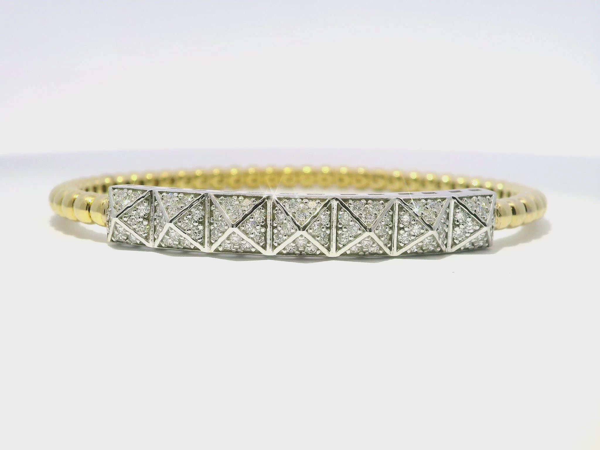 This 1.01CT Diamond Bangle in 14k Yellow Gold is a classic and luxurious addition to any jewelry collection. The sparkling diamonds, totaling 1.01CT, are elegantly set in a 14k yellow gold bangle for a timeless and sophisticated look. Perfect for any occasion, this bangle is sure to make a statement and add a touch of glamour to any outfit.