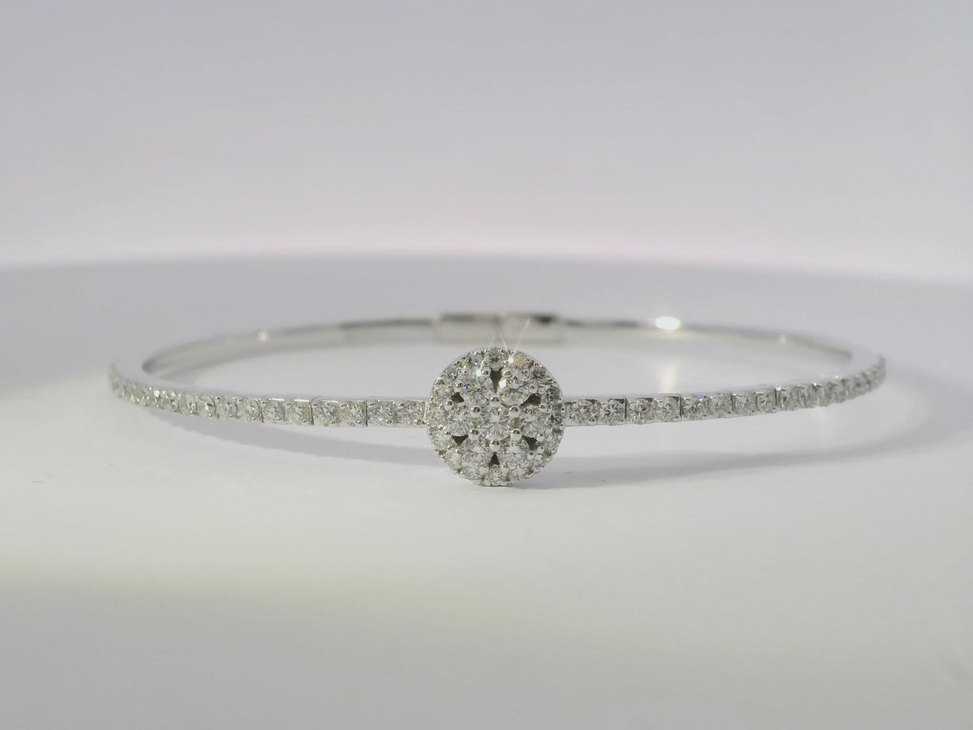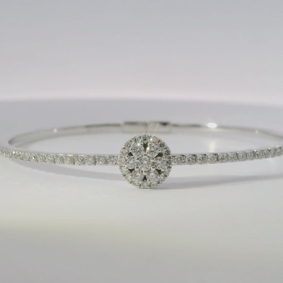 From the expert at the luxury jewelry brand, indulge in the beauty of 1.14 carats of sparkling diamonds set on an 18k white gold bangle. Impeccably crafted with timeless elegance, this bangle is the ultimate accessory for the sophisticated woman who values quality and luxury.