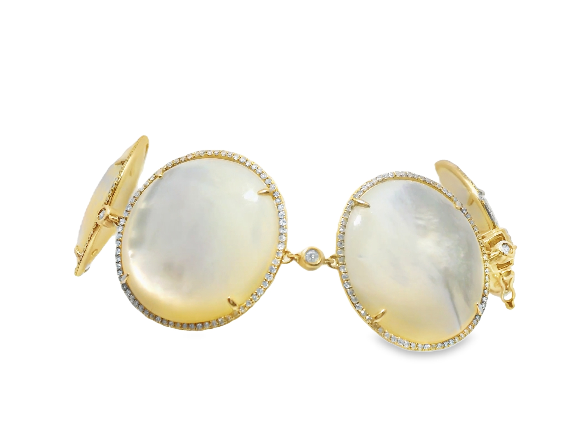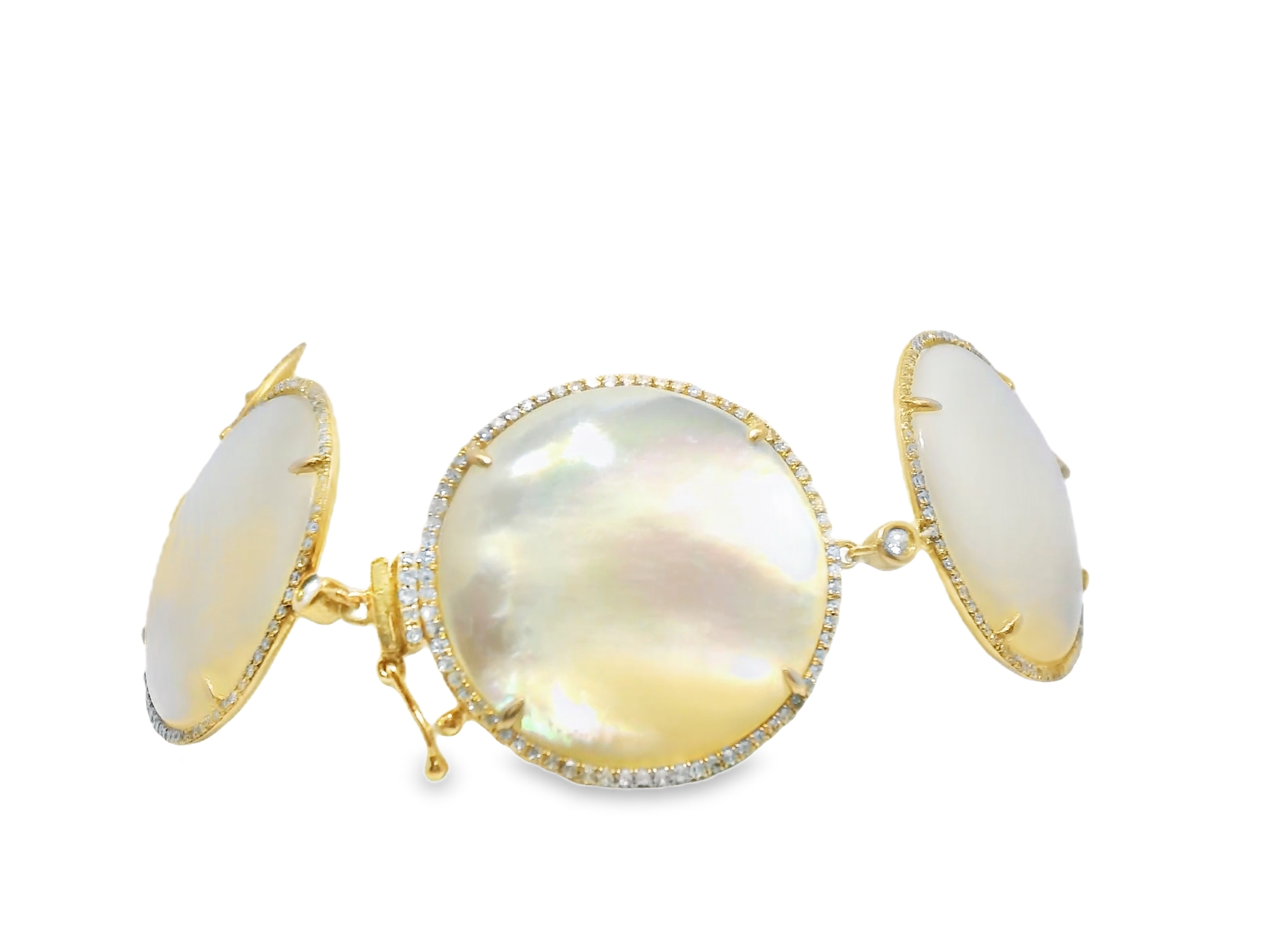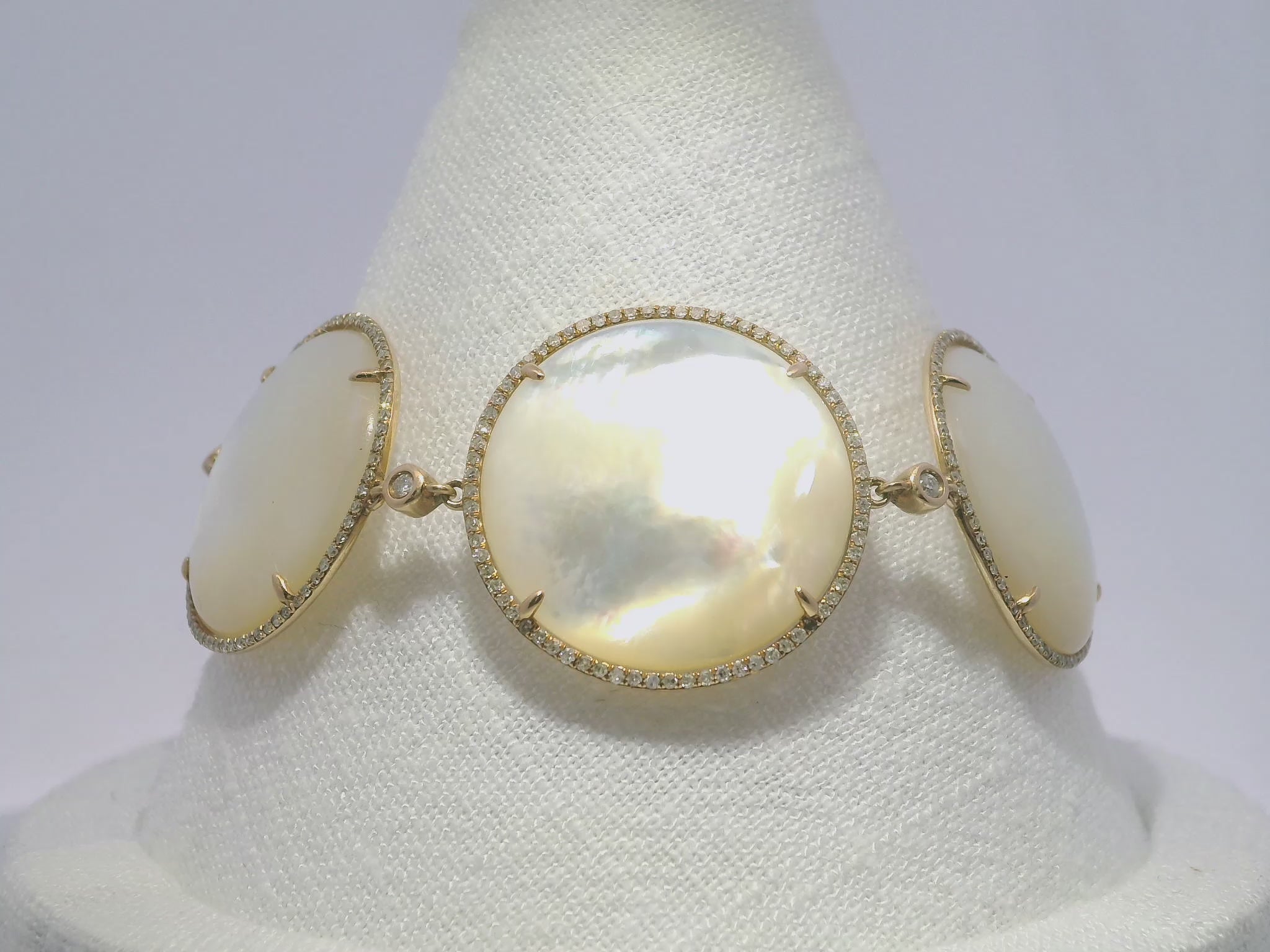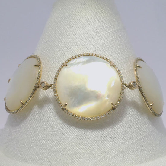 This exquisite bracelet features a stunning combination of diamonds and white mother of pearl set in 14k rose gold. With a total diamond weight of 1.46 carats and a white mother of pearl weight of 106.20 carats, this piece is a true masterpiece. Perfect for any special occasion, this bracelet exudes elegance and sophistication.
