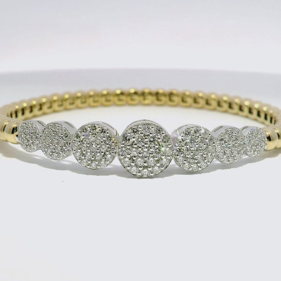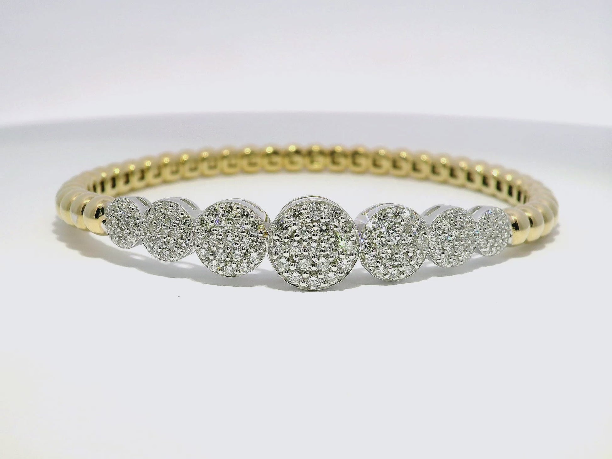 Expertly crafted with 14k yellow gold, this 1.59CT graduated diamond disk stretch bangle boasts a unique design of plain beads. The delicate diamonds are carefully placed, adding a touch of elegance and shine. Elevate any outfit with this timeless piece.
