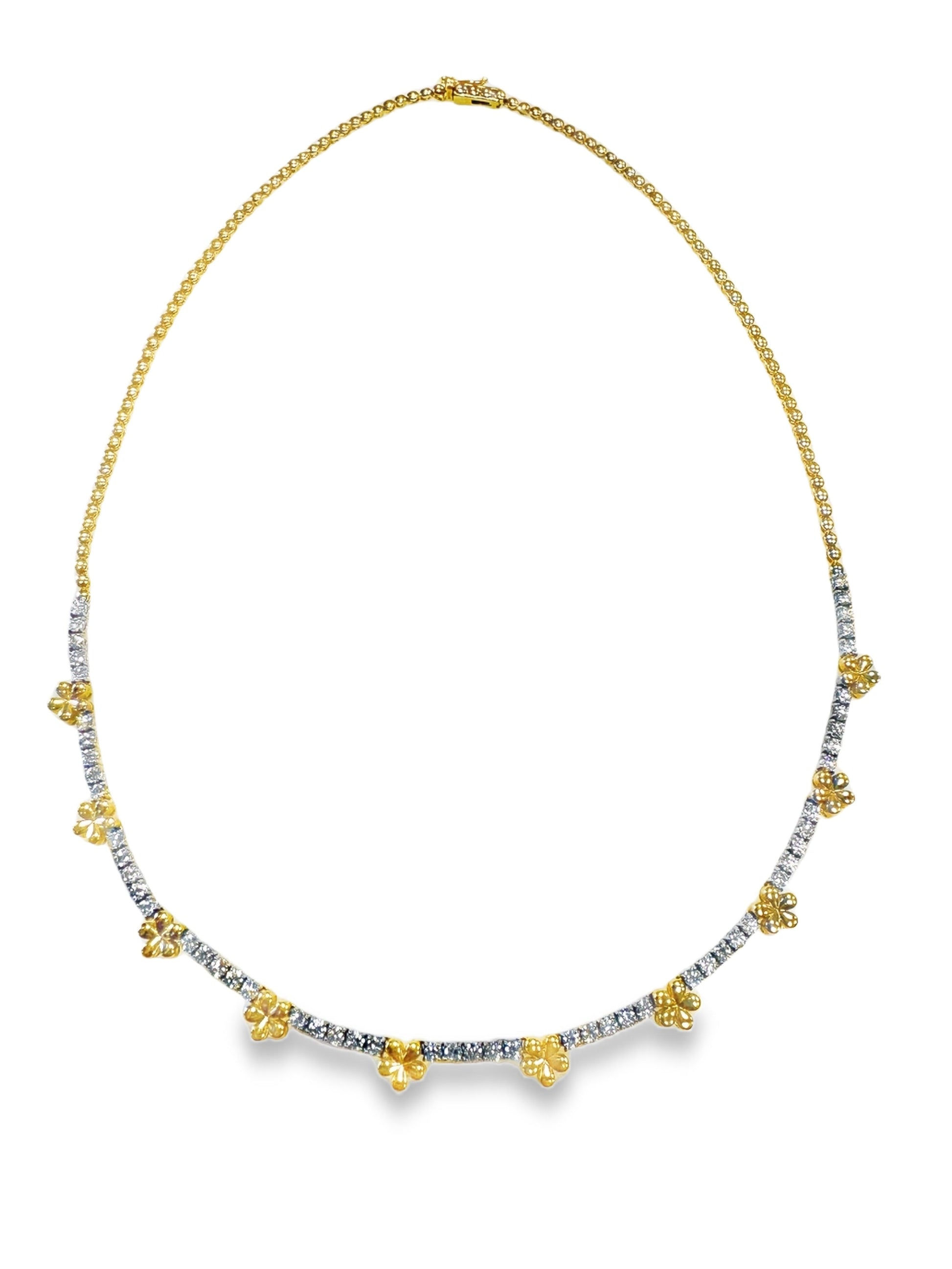Dazzle with this exquisite diamond necklace, crafted in radiant yellow gold. This fine piece showcases round brilliant cut diamonds set in a delicate floral motif. A timeless and elegant adornment, perfect for adding a touch of sparkle to any ensemble.