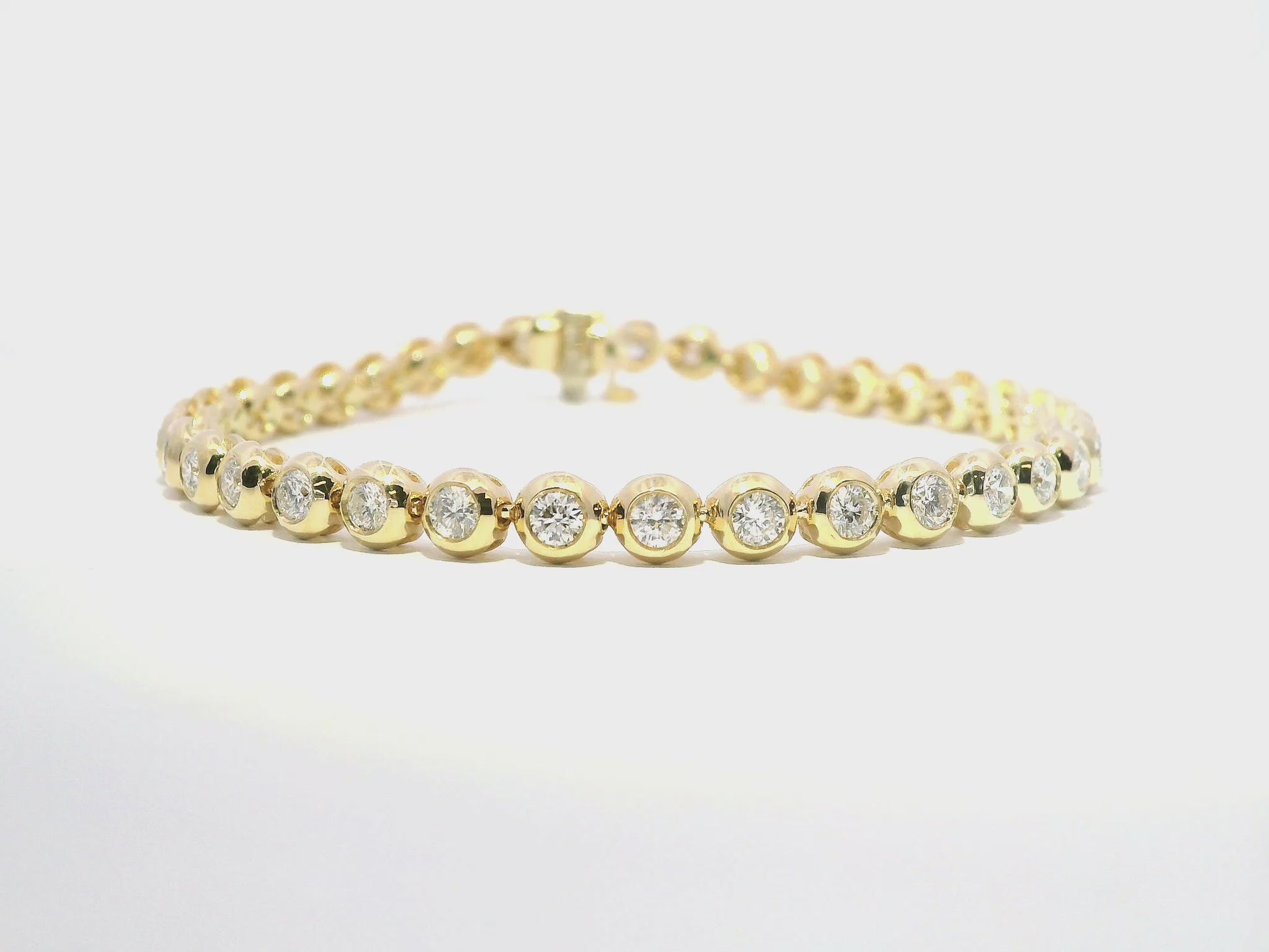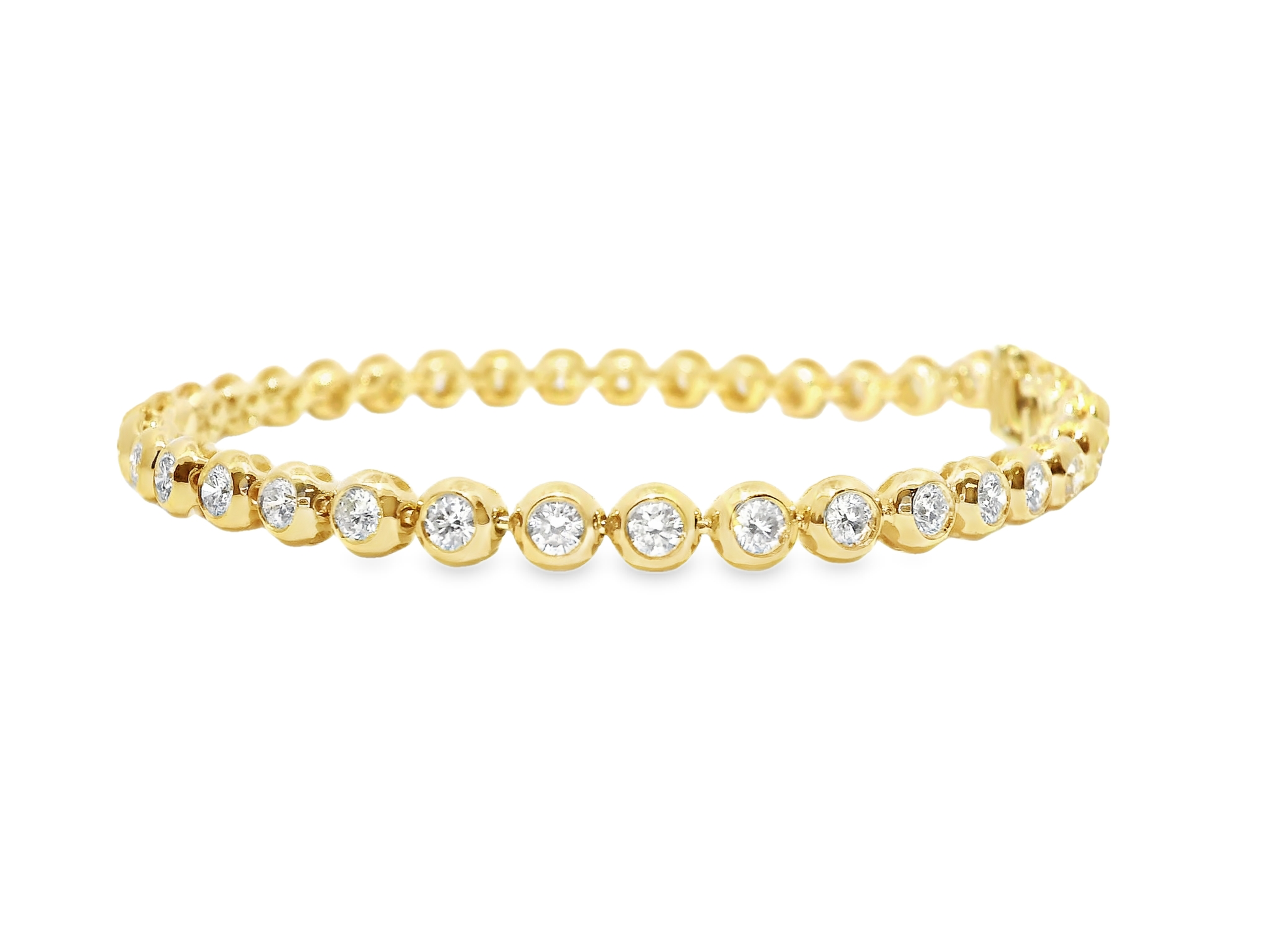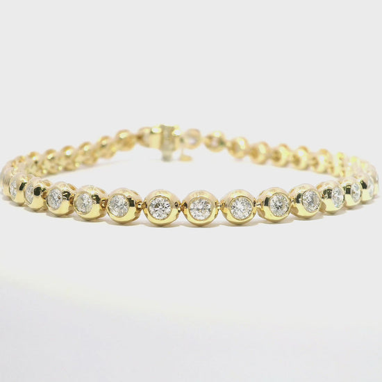 Elevate your jewelry collection with this exquisite 2.98CT Diamond Bezel Bracelet crafted in luxurious 14k Yellow Gold. Each diamond is meticulously set in a sophisticated bezel setting, creating a seamless, contemporary look while ensuring maximum brilliance and security. The substantial 2.98 carat total weight delivers remarkable sparkle and presence on the wrist, making this piece perfect for both special occasions and everyday elegance.