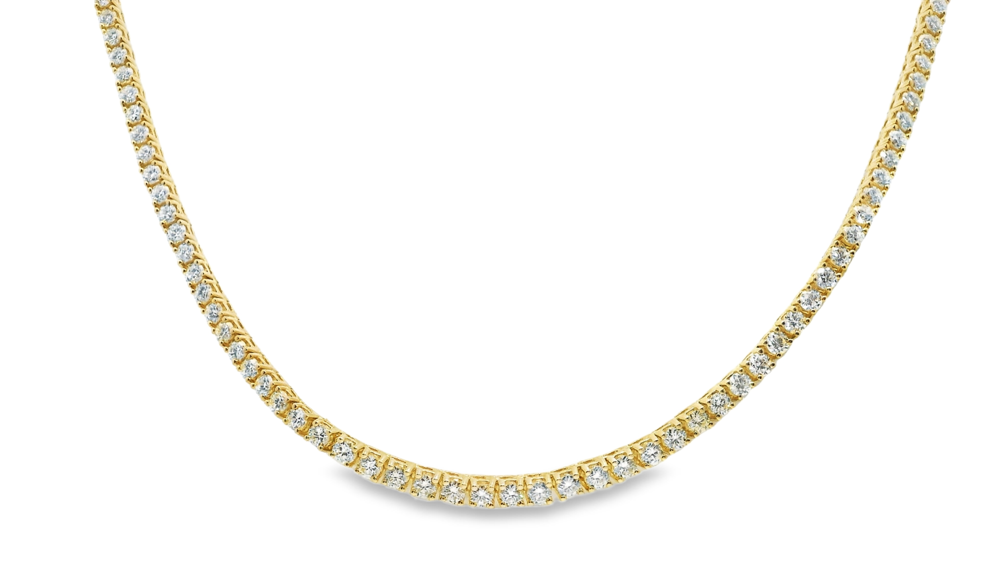 Elevate your collection with this 3.15-carat diamond tennis necklace, featuring securely set stones in 4-prong settings that extend halfway along the chain. Crafted in 14k yellow gold, this piece offers both durability and timeless warmth. Ideal for sophisticated layering or as a standout accent, it balances brilliant sparkle with expert craftsmanship for a refined statement.
