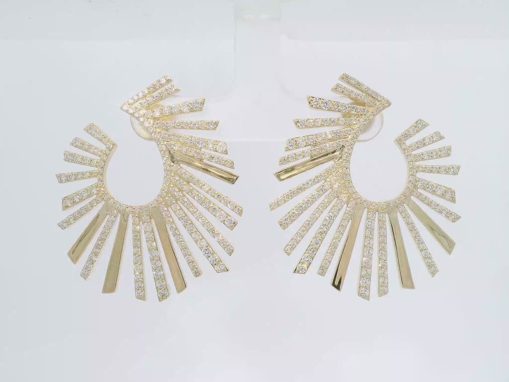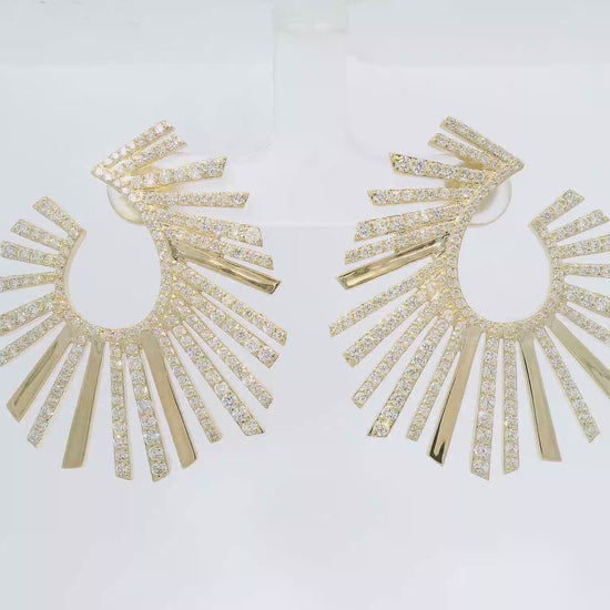 Radiant 3.53CT sunburst earrings crafted in lustrous 14k yellow gold. These statement pieces feature a dynamic design that catches light beautifully, making them perfect for special occasions or everyday elegance. The warm glow of yellow gold complements any skin tone, while the generous carat weight ensures impressive sparkle and presence. A timeless addition to any jewelry collection.