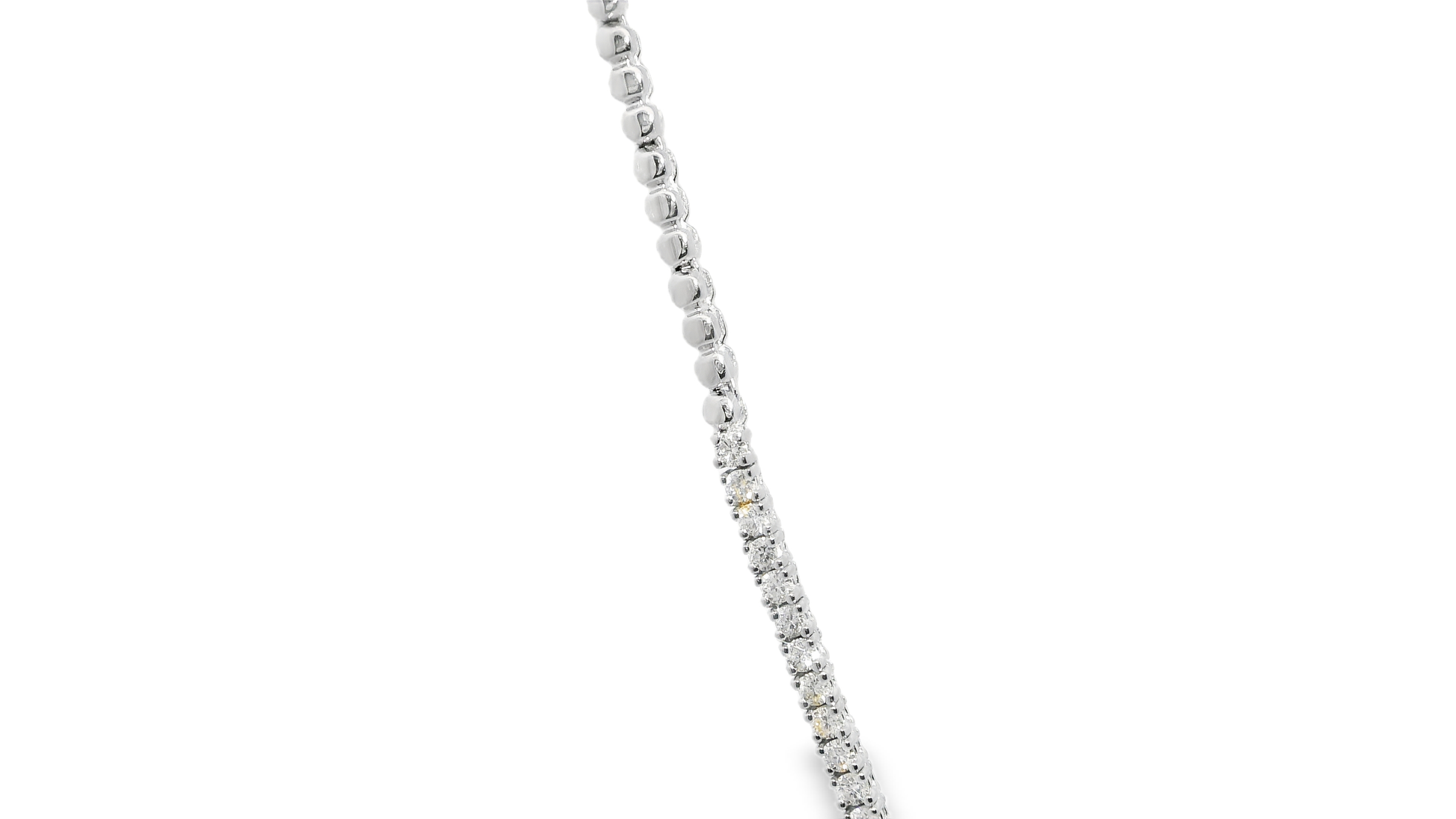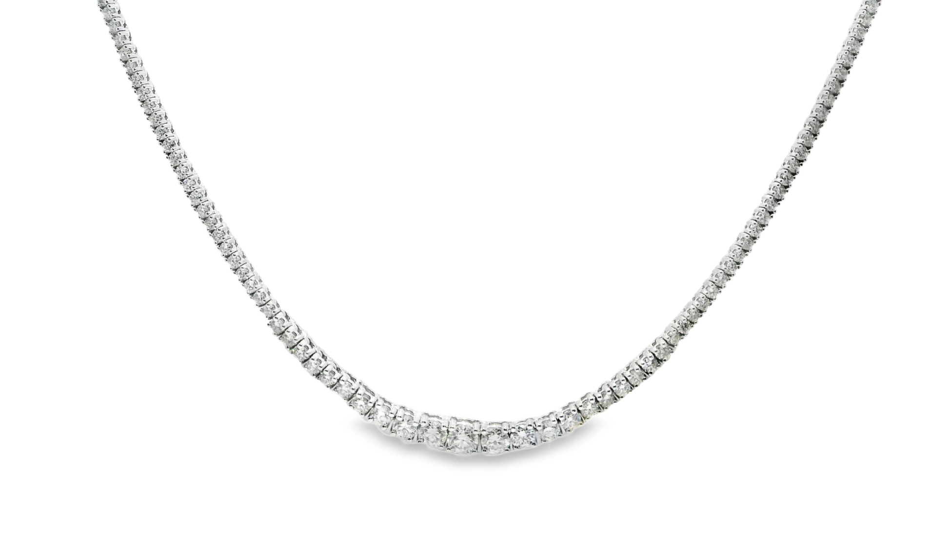 Discover the radiant beauty of the 3.75CT Graduated Diamond Tennis Necklace in 14K white gold. Featuring expertly graduated diamonds, this piece offers a dazzling sparkle that enhances any outfit, from everyday elegance to special occasions. The durable yet refined 14K white gold setting ensures lasting shine and comfort. Elevate your jewelry collection with this timeless necklace designed to captivate and impress.