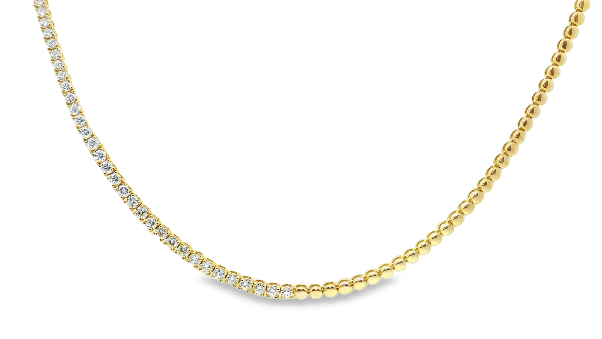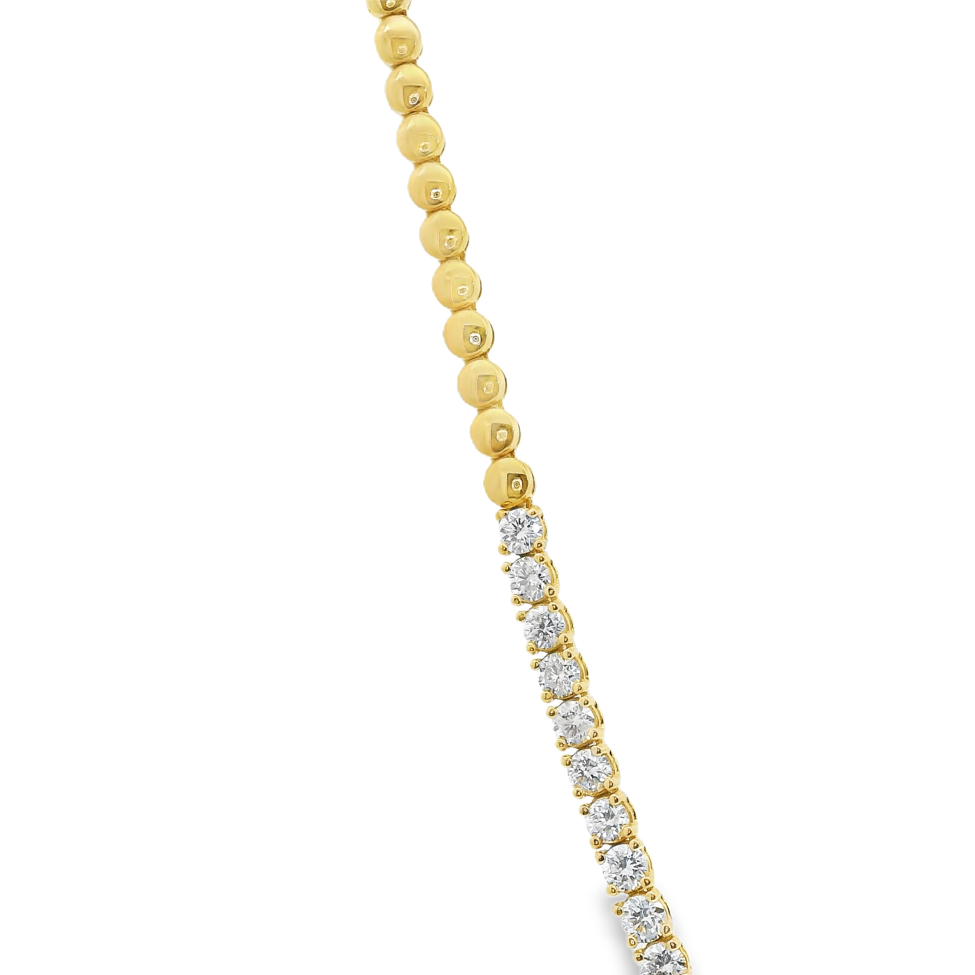 This 3.82-carat diamond half-way tennis bracelet features expertly set stones in a secure 4-prong design, crafted from 14k yellow gold. Its refined setting highlights each diamond’s brilliance while ensuring durability, making it an elegant and lasting piece suitable for sophisticated occasions or daily wear.