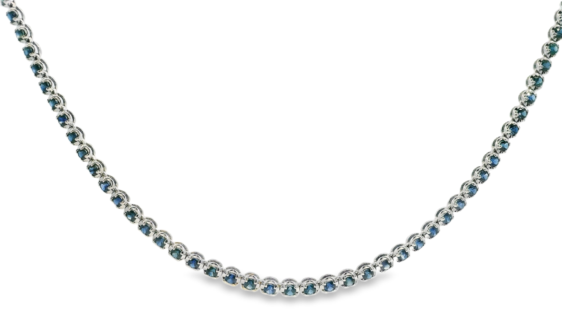 Elevate your collection with this exquisite 5.68-carat blue sapphire tennis necklace, crafted in elegant 14k white gold. The precision cut sapphires showcase a rich, captivating hue that offers timeless sophistication. Designed for both everyday wear and special occasions, this necklace delivers a refined balance of luxury and durability, highlighting your discerning taste in fine jewelry.