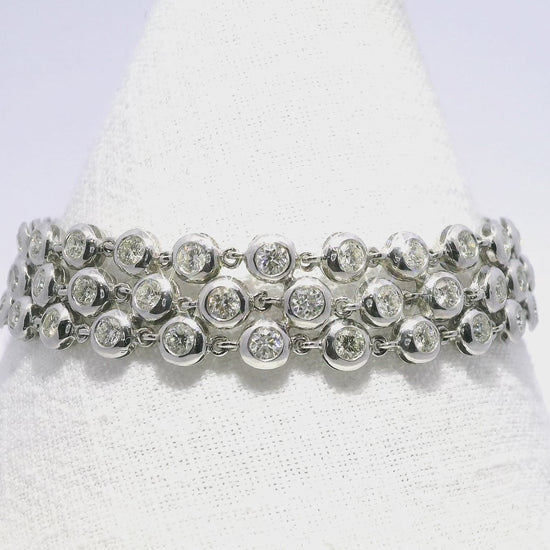 Elevate your fine jewelry collection with this exquisite 6.32CT three-row bezel bracelet crafted in premium 14k white gold. The meticulous bezel setting securely showcases each