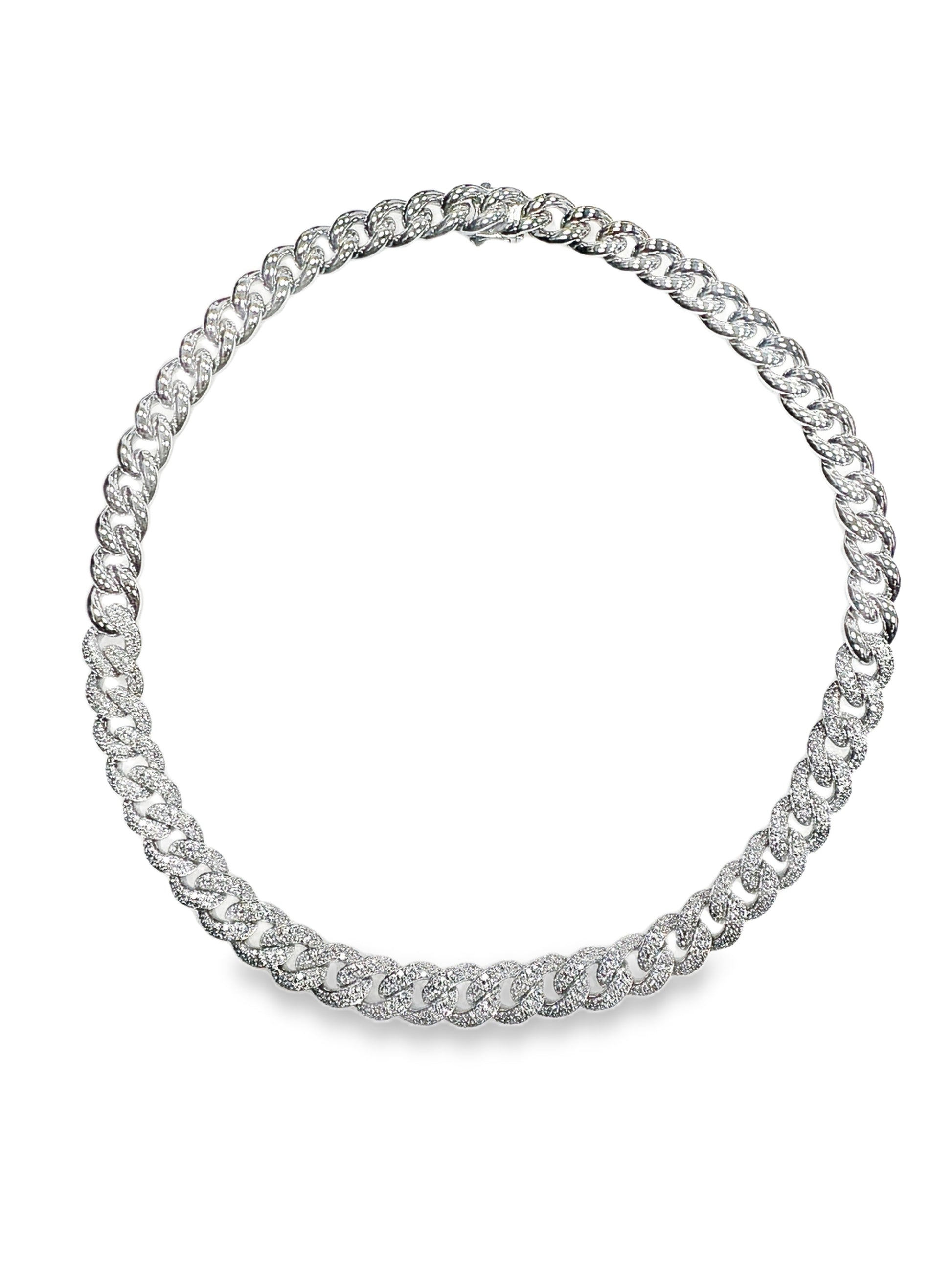 This 6-carat diamond Cuban chain link necklace in 14K white gold combines bold design with expert craftsmanship. The classic Cuban link style is enhanced by meticulously set diamonds, delivering exceptional brilliance and a refined, contemporary look. Ideal for those seeking a statement piece that balances luxury with timeless elegance.