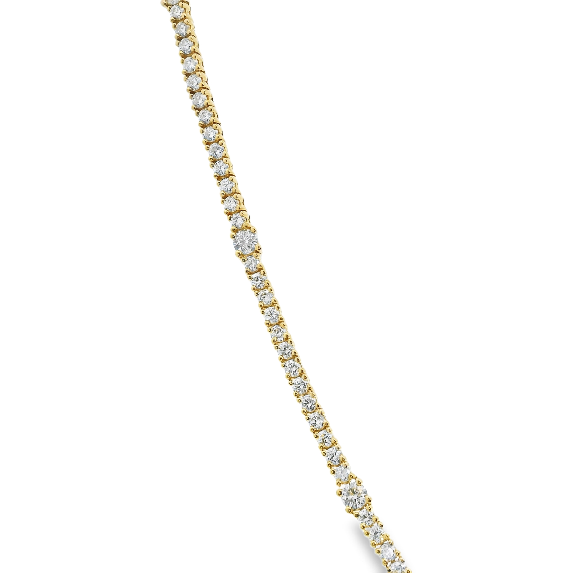 This 7.11-carat diamond graduated tennis necklace showcases meticulously set stones in a secure four-prong setting, enhancing each diamond's brilliance. Crafted from lustrous 14k yellow gold, it offers enduring elegance and durability. Designed for refined wear, this necklace seamlessly combines classic sophistication with expert craftsmanship, making it an exceptional statement piece for any distinguished jewelry collection.