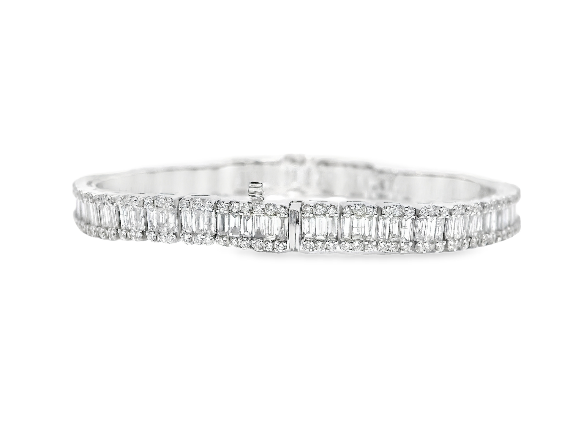 Exquisite 7.16Ct Emerald Cut Diamond Bracelet crafted in premium 18k white gold. This sophisticated piece features precision-cut emerald diamonds arranged to maximize brilliance and light reflection. The secure setting and refined craftsmanship ensure both durability and elegance, making this bracelet an investment-quality addition to any fine jewelry collection.