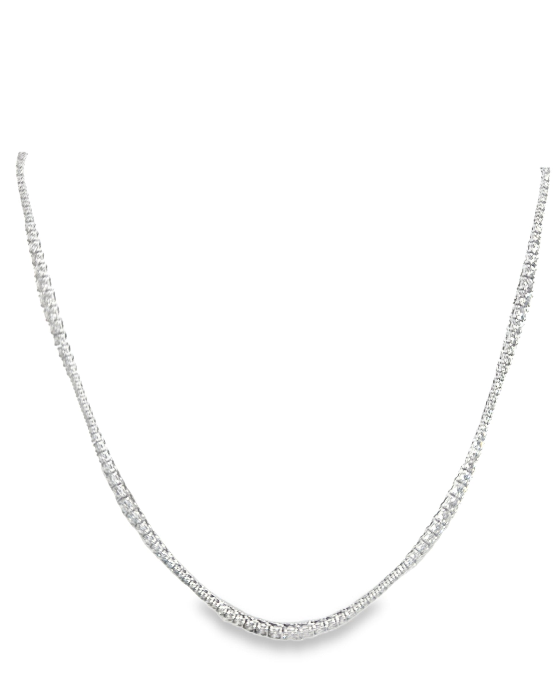 Crafted in 14k white gold, this tennis necklace features a graduated design with 7.57 carats of diamonds, each securely set in a classic 4-prong setting. The graduated stones enhance the necklace's elegance, offering a refined sparkle ideal for both everyday wear and special occasions. Its expert craftsmanship ensures durability while showcasing the brilliance of each diamond with sophisticated simplicity.