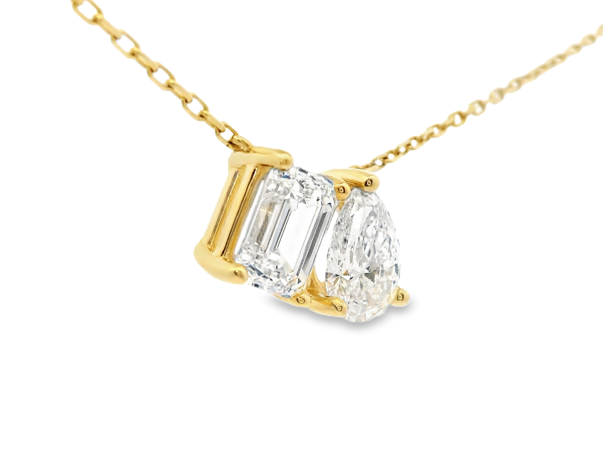 This stunning pendant features a 1.89CT lab diamond in an elegant emerald cut, accented by a 1.38CT pear shape lab diamond, set in 14k gold. Expertly crafted for a timeless and luxurious look. Elevate any outfit with this sophisticated piece.