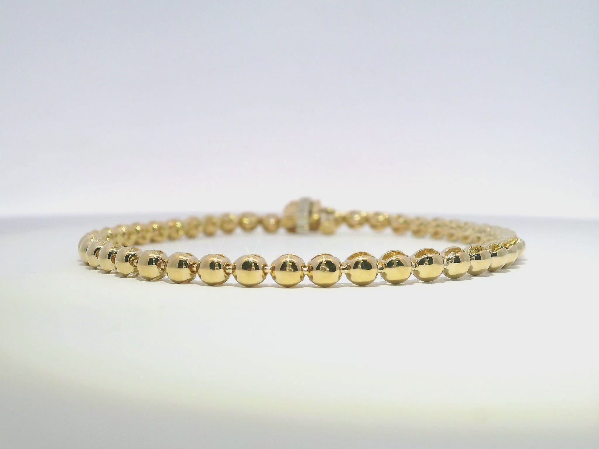 Crafted from luxurious 14k yellow gold, this plain beaded bracelet offers timeless elegance with exceptional durability. The meticulously crafted spherical beads create a subtle texture that catches light beautifully, making it perfect for everyday wear or special occasions. This versatile piece complements both casual and formal attire while maintaining its brilliant luster through years of wear.
