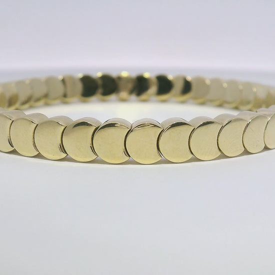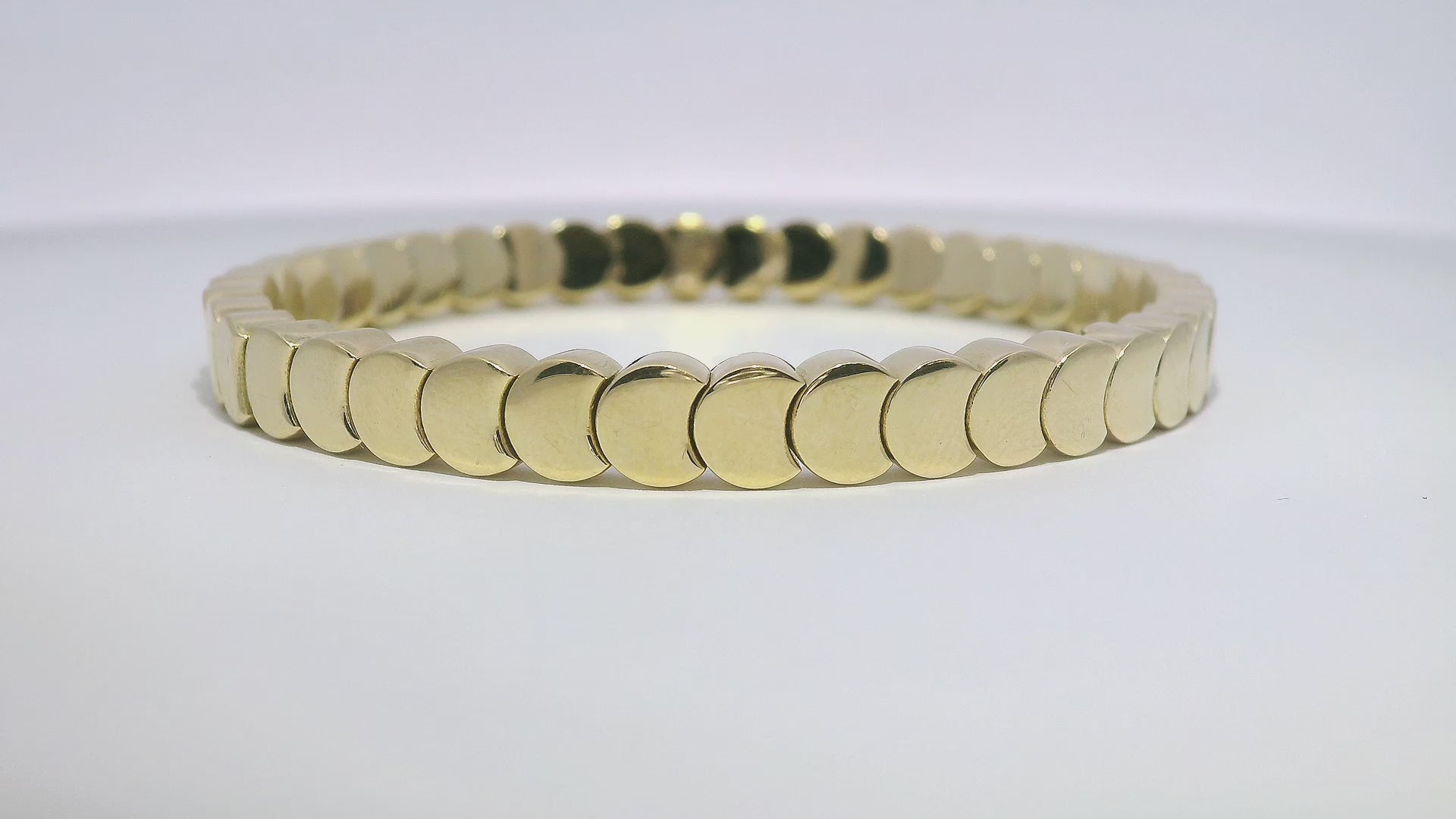This 14k yellow gold bangle features a simple and elegant stretch design, providing a comfortable and secure fit for any wrist. Crafted with high-quality materials, this versatile piece can be worn for any occasion and will compliment any outfit. Stay stylish and classy with our Plain Stretch Bangle.